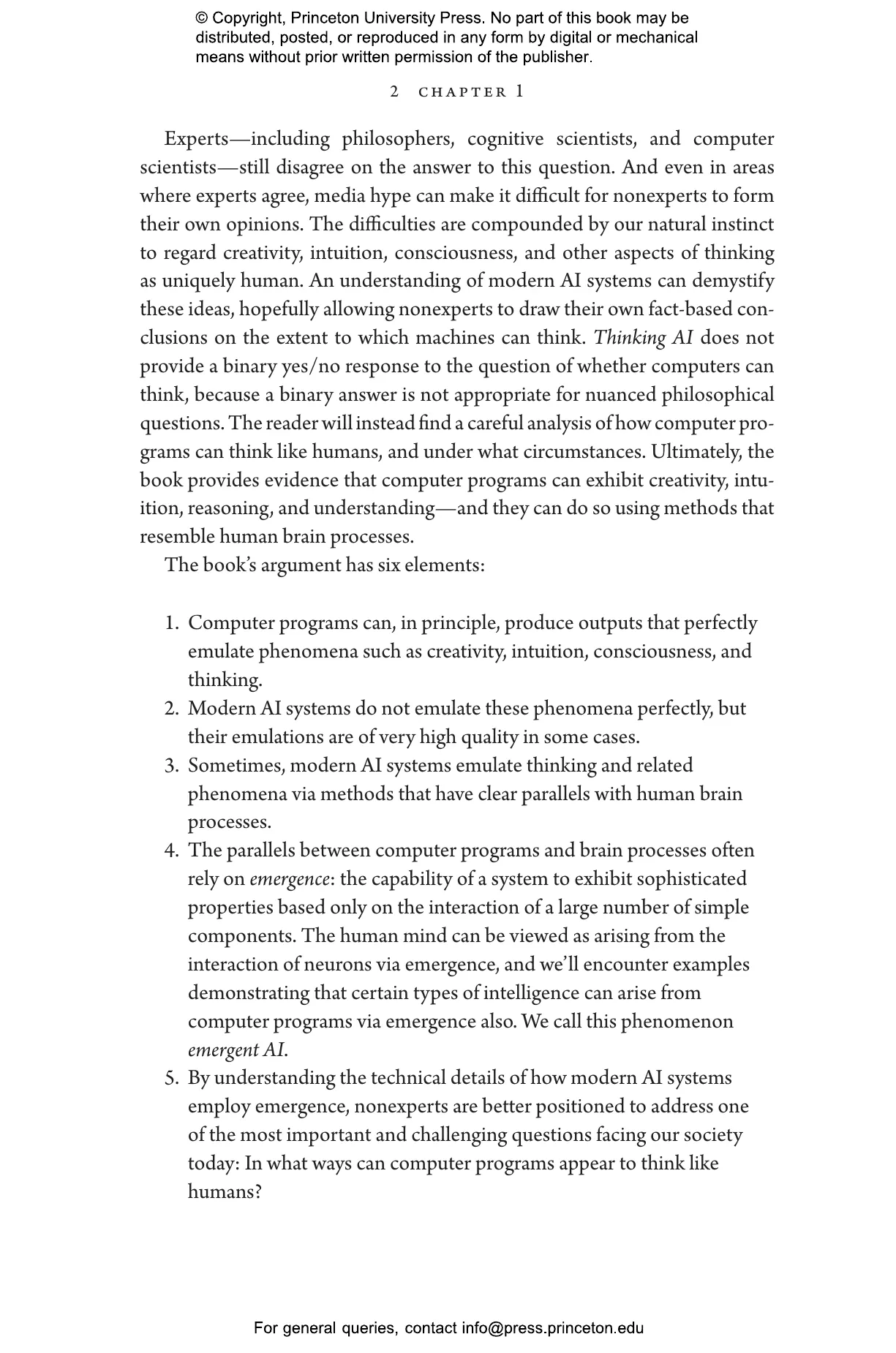 MacCormick offers a tour of the most famous AI systems, including AlexNet and VGG16, deep neural networks for object recognition that led to a Nobel prize; DeepMind鈥檚 AlphaGo, which shocked AI researchers with its superhuman performance in the game of Go; and OpenAI鈥檚 ChatGPT, which stunned the world with its natural language capabilities. He describes how each system works, and points to parallels with human brain processes. Both human minds and computer programs, MacCormick explains, can induce intelligence through emergence: the capability for new phenomena to emerge from the interactions of many small, simple components. Does this mean that a computer program can think like a human? In many ways, MacCormick argues, the answer is yes. In Thinking AI, he reveals a new landscape of emergent intelligence鈥攁 world in which computer programs can emulate many or all aspects of human thinking but humanity retains its meaning and purpose.