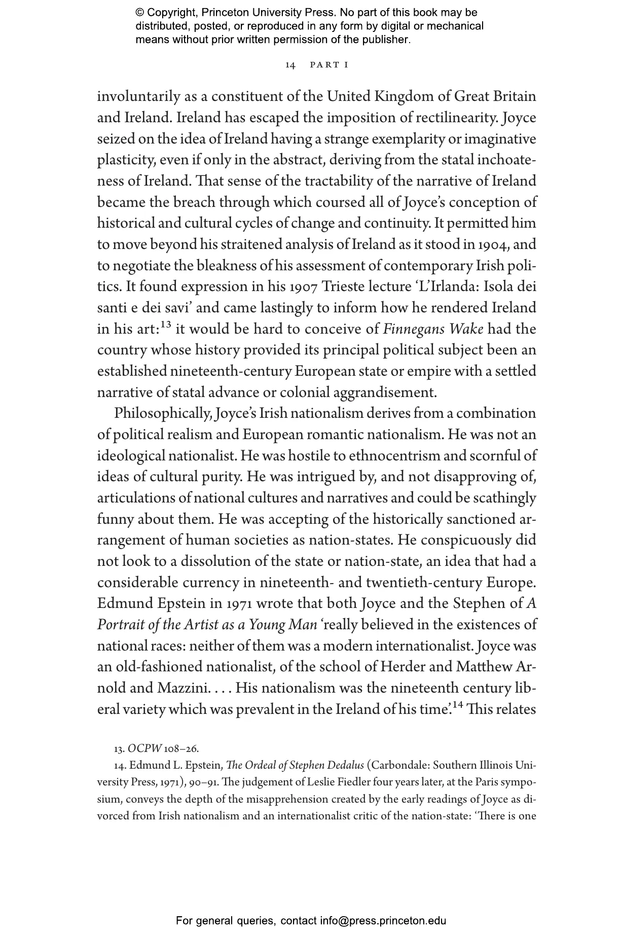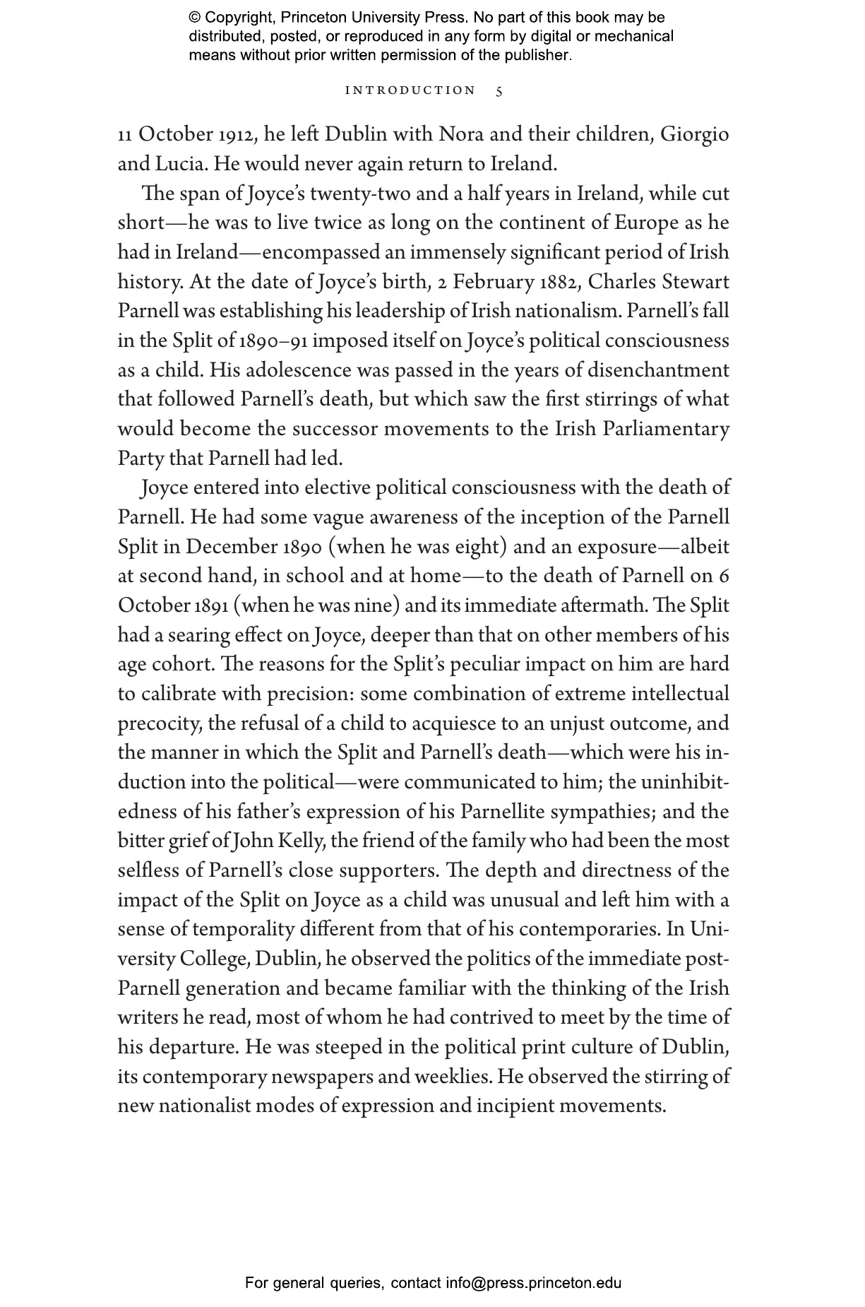 Joyce was eight years old in 1890 when the O’Shea divorce scandal tore Irish nationalism apart, leading to the split in the Irish Parliamentary Party, the death of nationalist leader Charles Stewart Parnell, and a long, bitter period dominated by the anti-Parnellites. This was the Ireland that Joyce grew up in and rebelled against, and which determined his literary direction. Callanan uncovers a Joyce who was a highly original and dissenting Irish nationalist, who refused to avow or vaunt his nationalism and whose understanding was refined by the experience of living in multicultural Trieste with its fraught ethnic politics and differing models of statehood. Callanan’s Joyce is as heroic as Ellmann’s defiantly modernistic artist but in a more interesting way—a writer who didn’t lack political conviction but whose views didn’t yield to the expectations of his time.