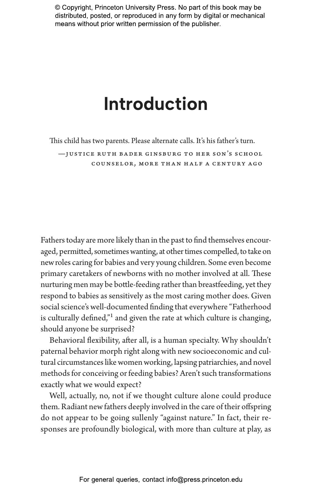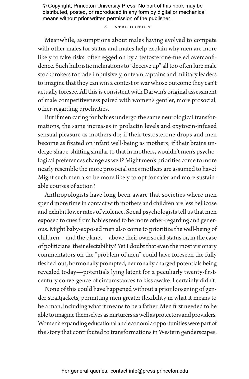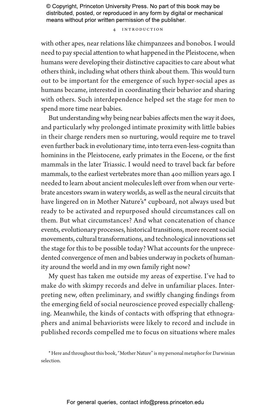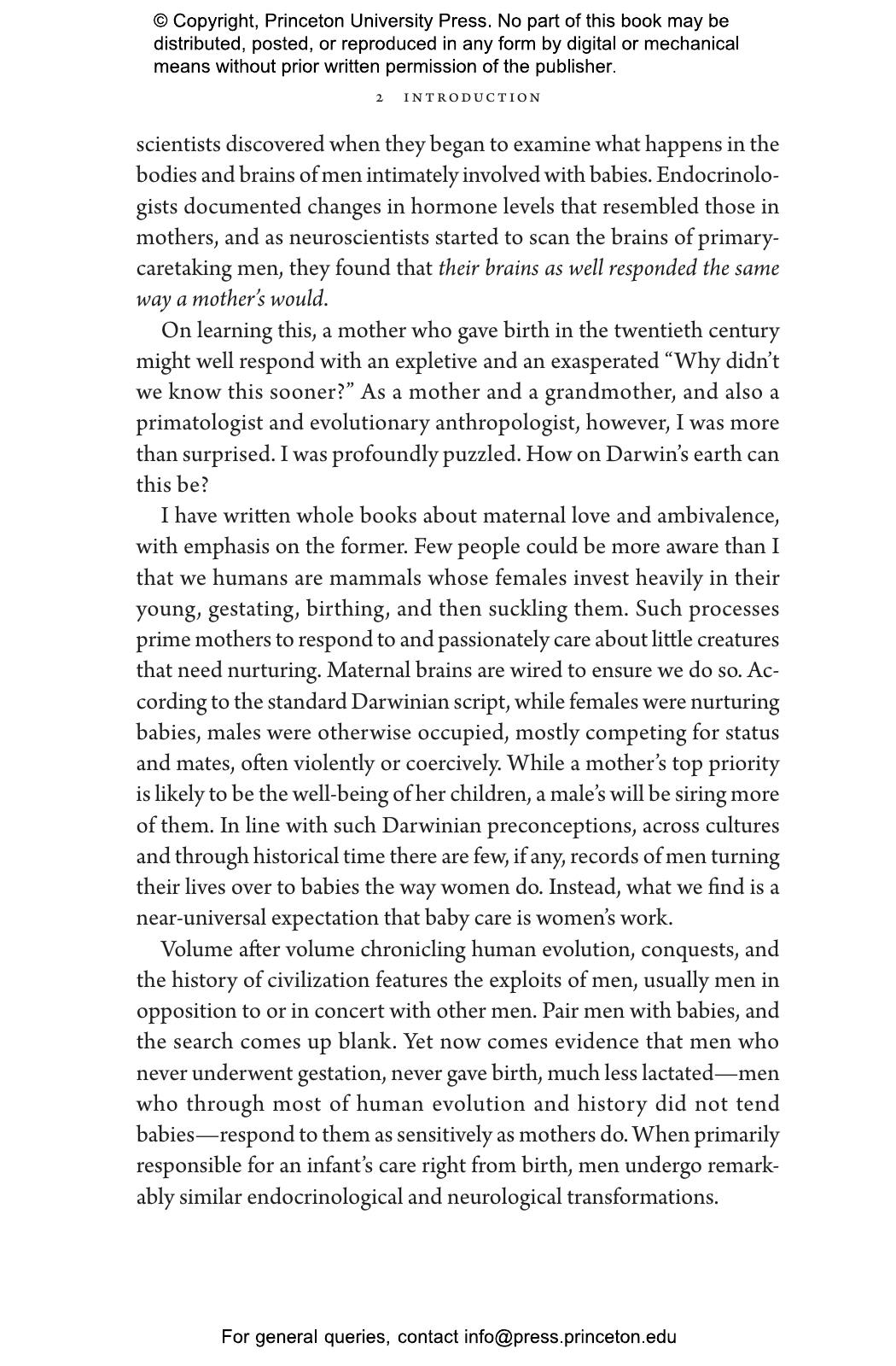 “Who better than Sarah Hrdy, known for her studies of motherhood, to delve into fatherhood. Men caring for babies or young children can be as tender and competent as women. Doing so transforms their brains to be more like the maternal brain. Hrdy’s timely point is that attempts to balance gender roles in the family by no means go against human nature.”—Frans de Waal, author of Different: Gender Through the Eyes of a Primatologist