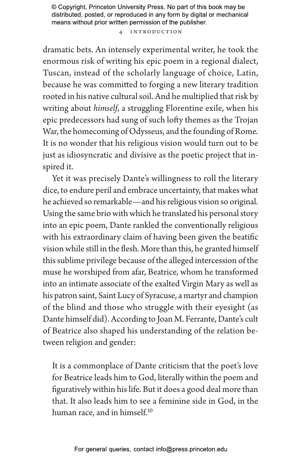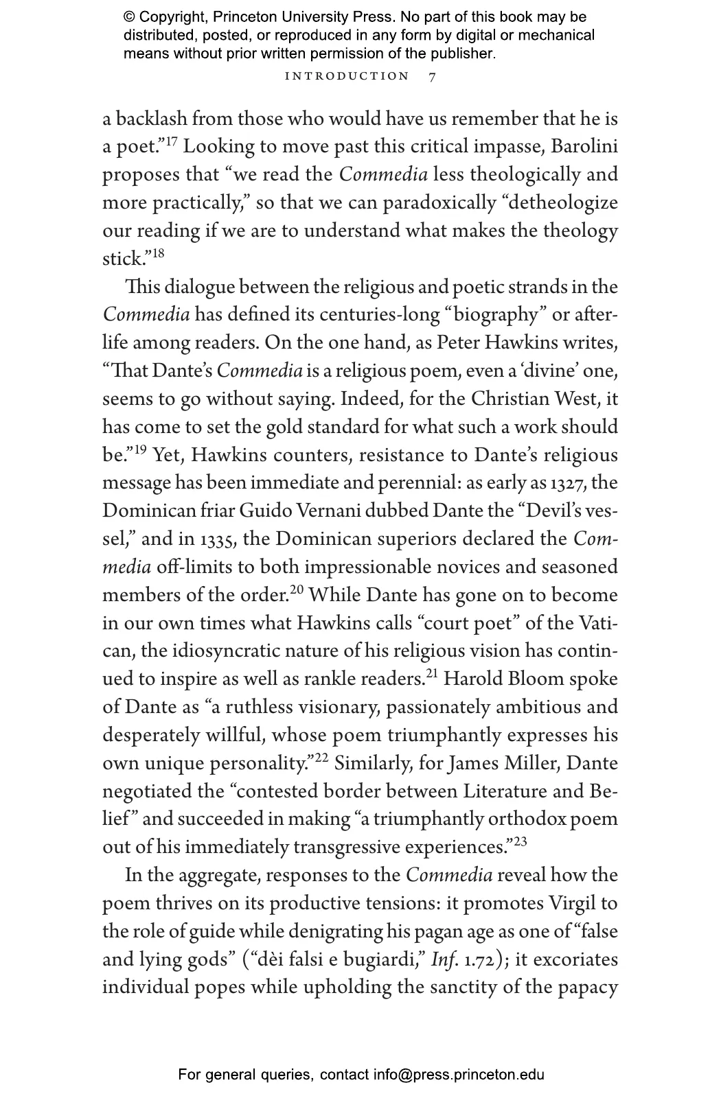 Written during his exile from Florence in the early 1300s, Dante Alighieri鈥檚 Divine Comedy describes the poet鈥檚 travels through hell, purgatory, and paradise, exploring the state of the human soul after death. His poema sacro, sacred poem, profoundly influenced Renaissance writers and artists such as Giovanni Boccaccio and Sandro Botticelli and was venerated by modern critics including Erich Auerbach and Harold Bloom. Dante鈥檚 鈥淒ivine Comedy鈥 narrates the remarkable reception of Dante鈥檚 masterpiece, one of the most consequential religious books ever written.