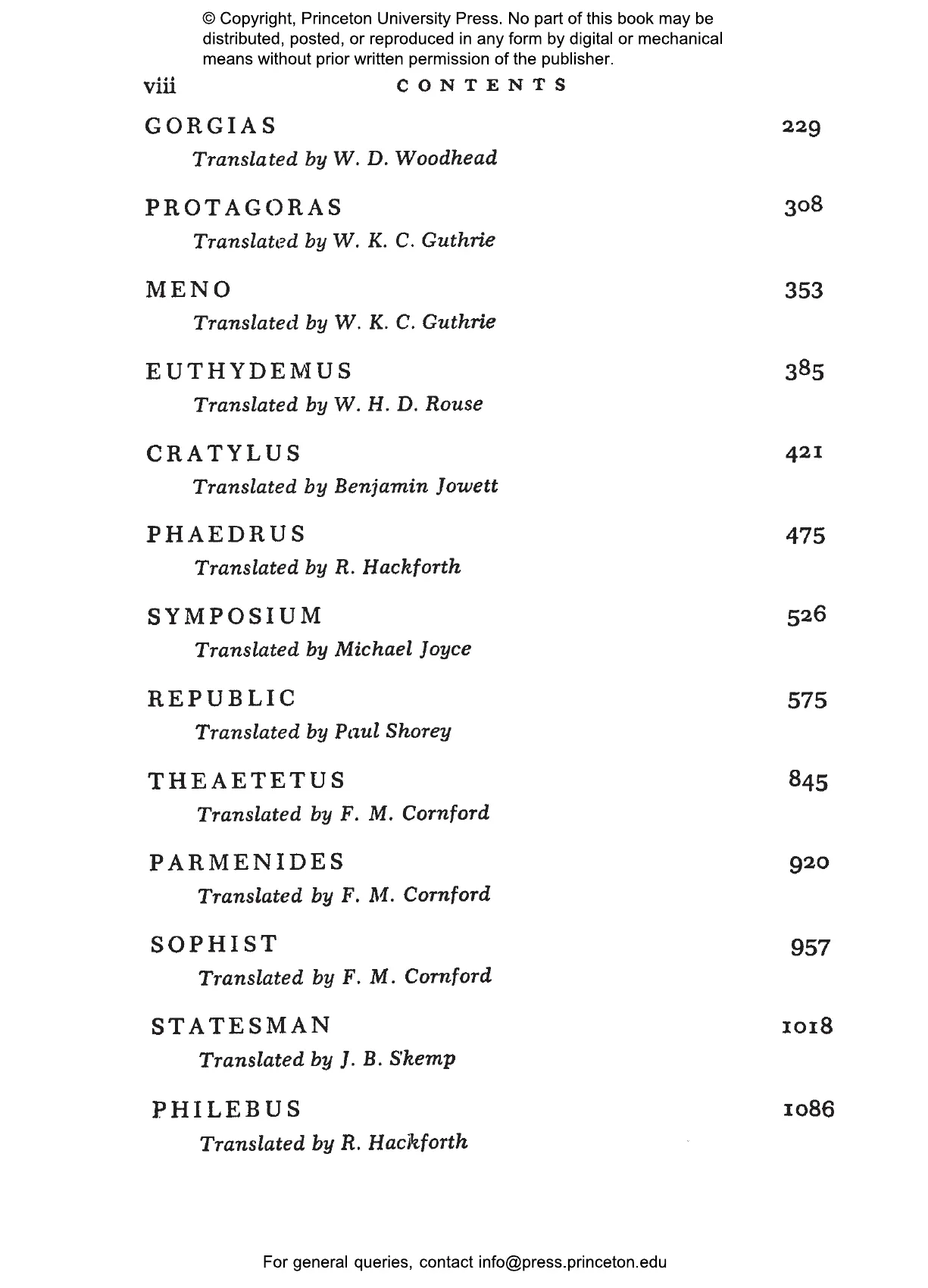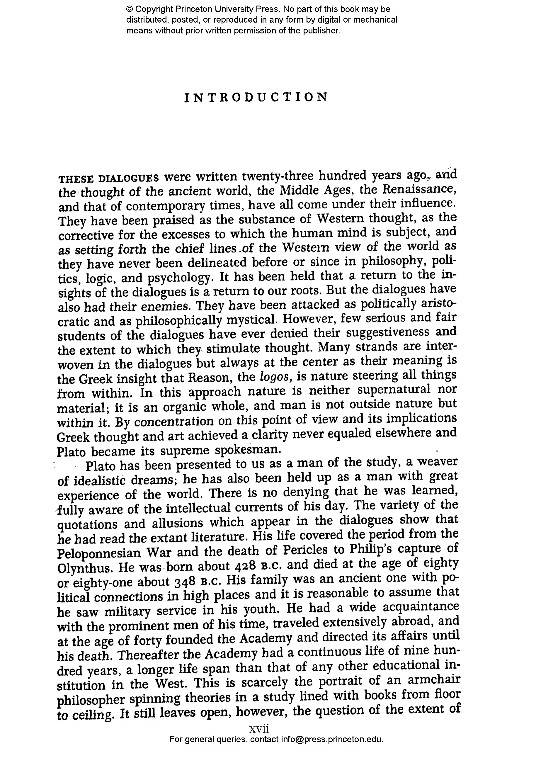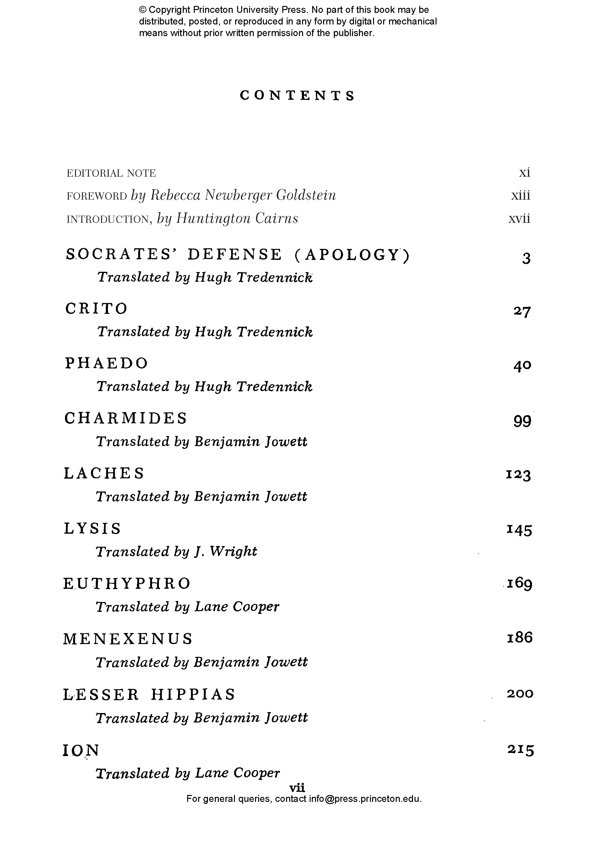 Edith Hamilton (1867–1963) was perhaps the most famous and influential classicist of the twentieth century. Her bestselling Mythology remains a standard version of the stories of the ancient world. Huntington Cairns (1904–1985) was a writer and lawyer who worked at different times for the U.S. Treasury, the National Gallery of Art in Washington, DC, and Johns Hopkins University. Rebecca Newberger Goldstein is a philosopher and novelist whose books include Plato at the Googleplex: Why Philosophy Won’t Go Away and Thirty-Six Arguments for the Existence of God: A Work of Fiction.