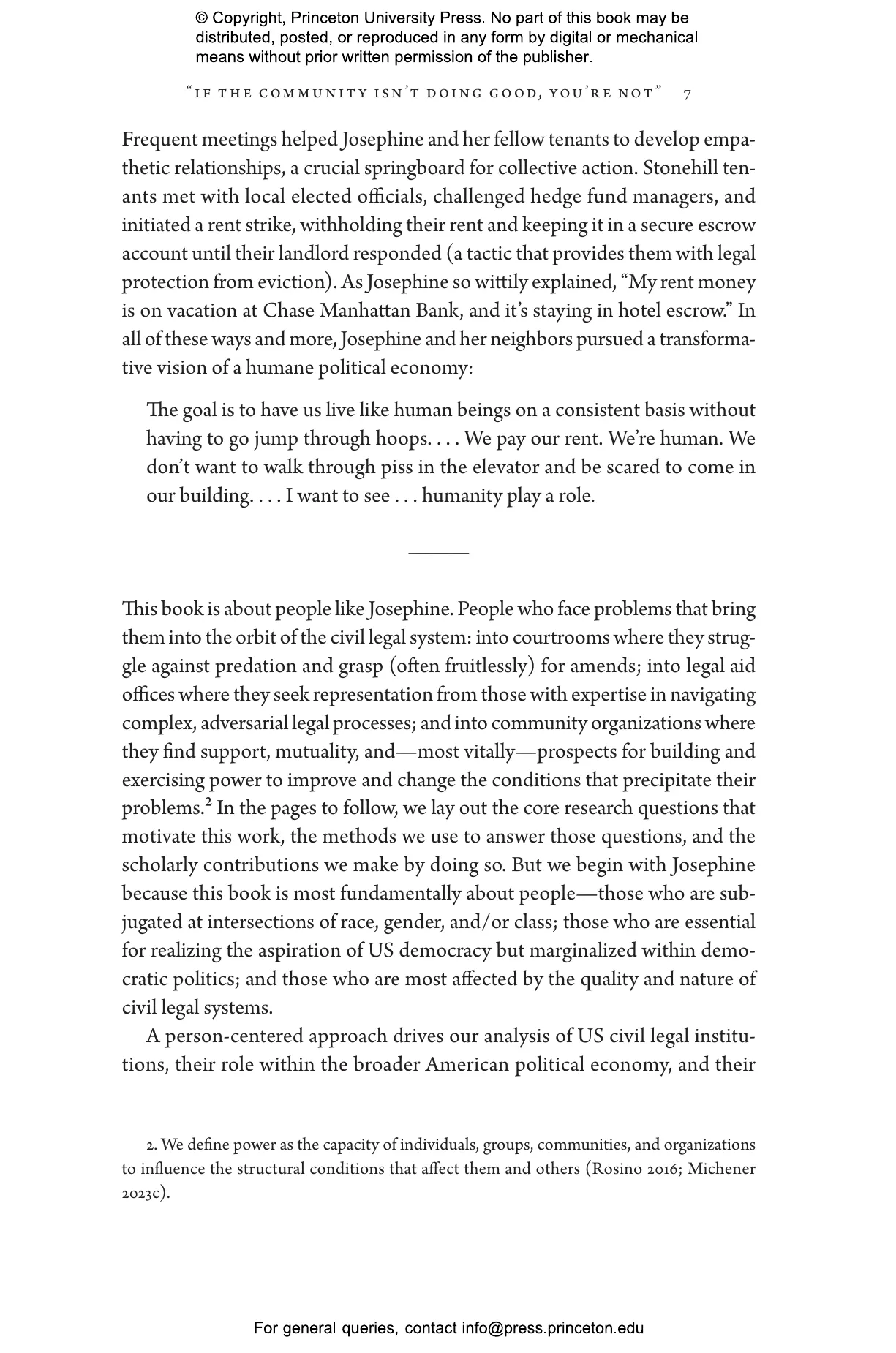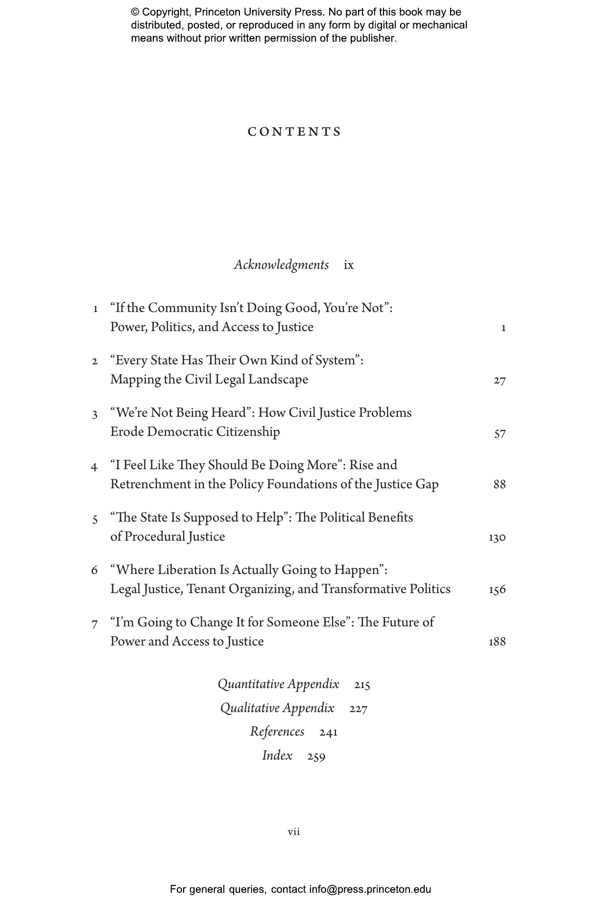 Jamila Michener and Mallory SoRelle show how civil legal problems, and the institutions meant to address them, greatly erode trust in the legal system among marginalized communities, undermining their broader sense of democratic citizenship and political standing. While legal representation offers vital protections, increased access to justice through an ever-growing supply of lawyers does not address the structural problems that generate demand for lawyers in the first place. Looking at cases involving unfair evictions and substandard housing, Michener and SoRelle demonstrate how community groups such as tenants’ unions can fill this justice gap and provide the means to build political power that transforms the conditions that create precarity.