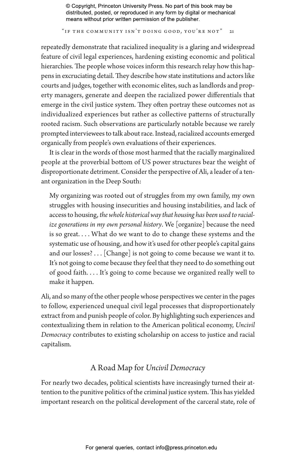 Each year, as many as 250 million Americans face civil legal problems like eviction, debt collection, and substandard housing. These problems are disproportionately shouldered by racially and economically marginalized people, particularly women of color. Civil courts and legal aid organizations are supposed to protect their rights, yet more than 90 percent of low-income people receive inadequate or no legal assistance. Instead, access to justice is reserved for those who can afford its high price. For those who can’t, the repercussions can be devastating, from homelessness and loss of public benefits to broken families and diminished health. Uncivil Democracy looks at the US civil justice system through the eyes of the people whose very citizenship is indelibly shaped by it.