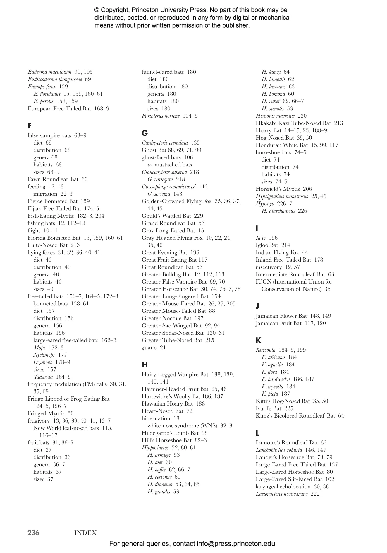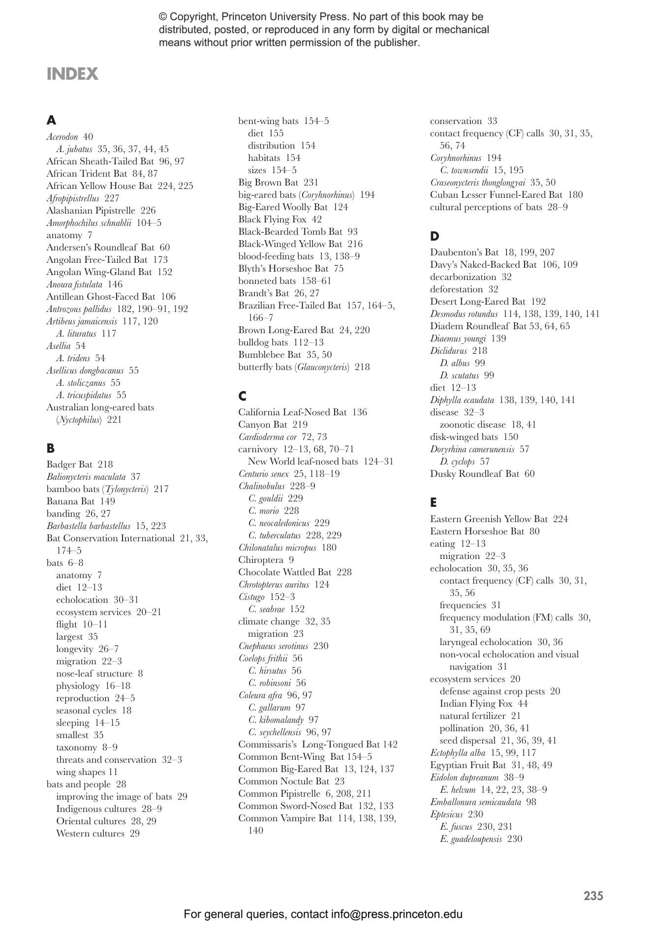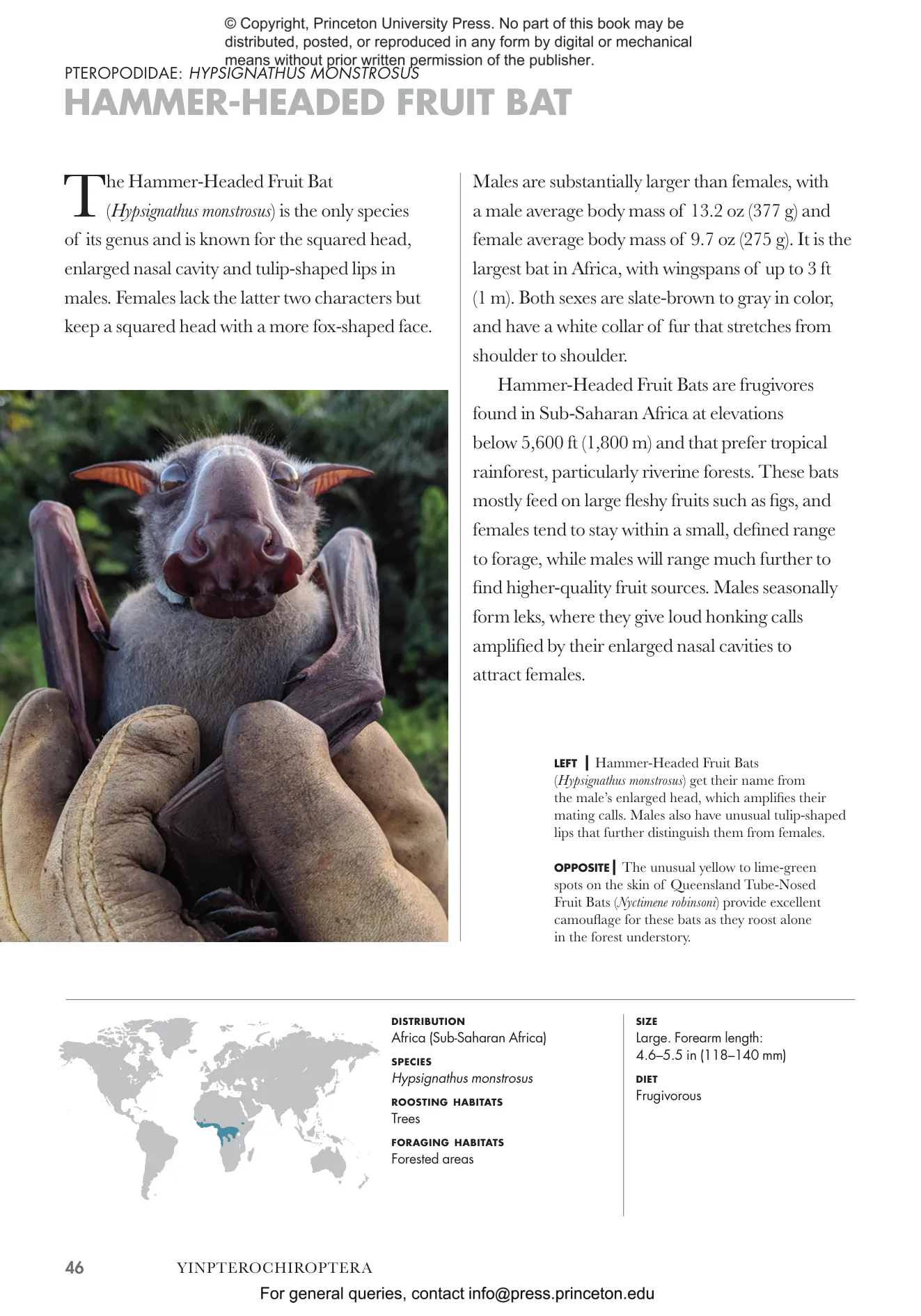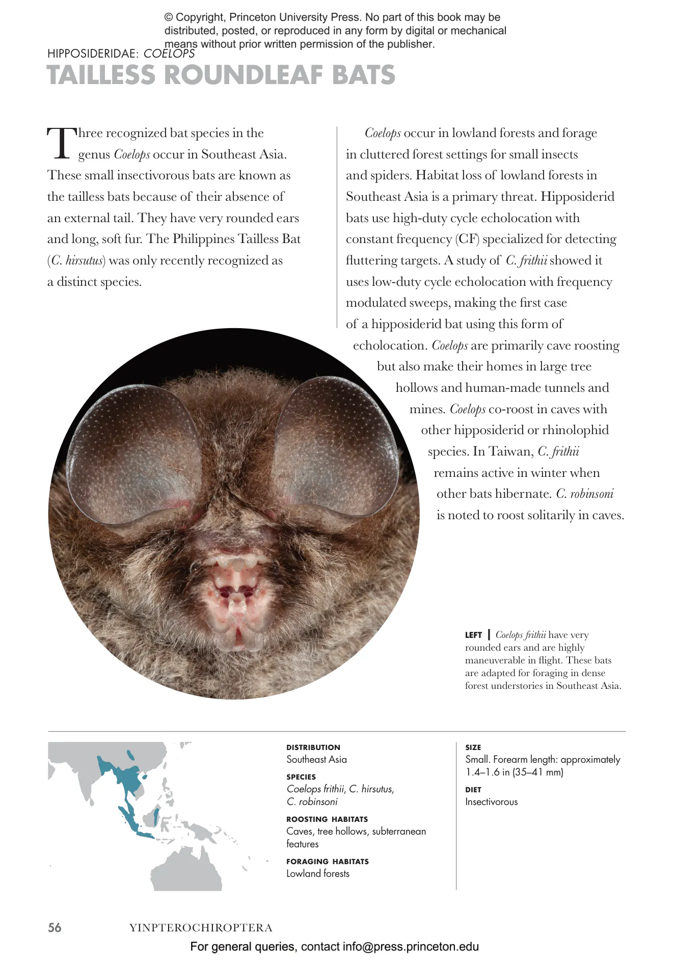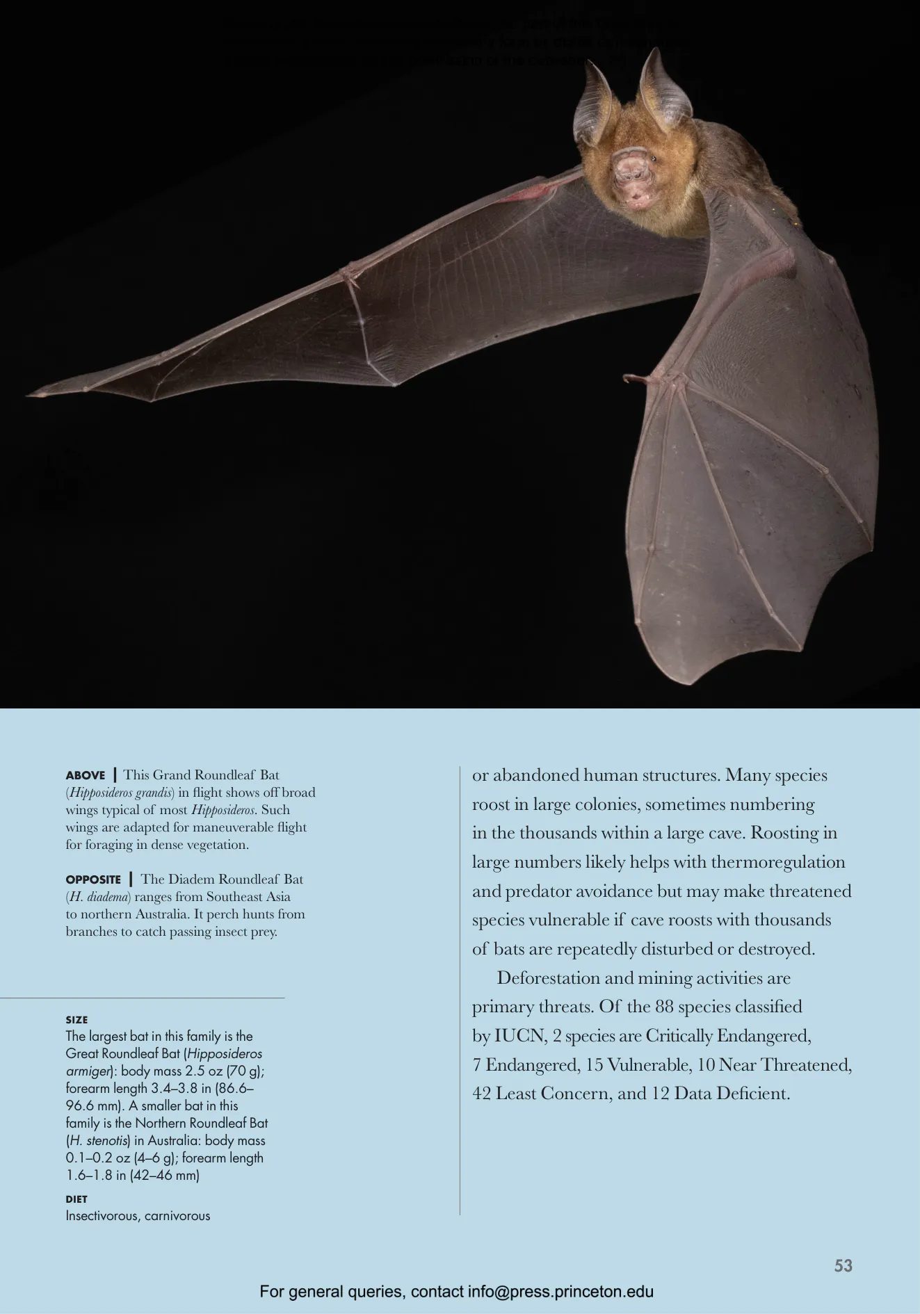 - Profiles bats from every family, detailing their unique features, distribution, numbers, conservation status, and habitat