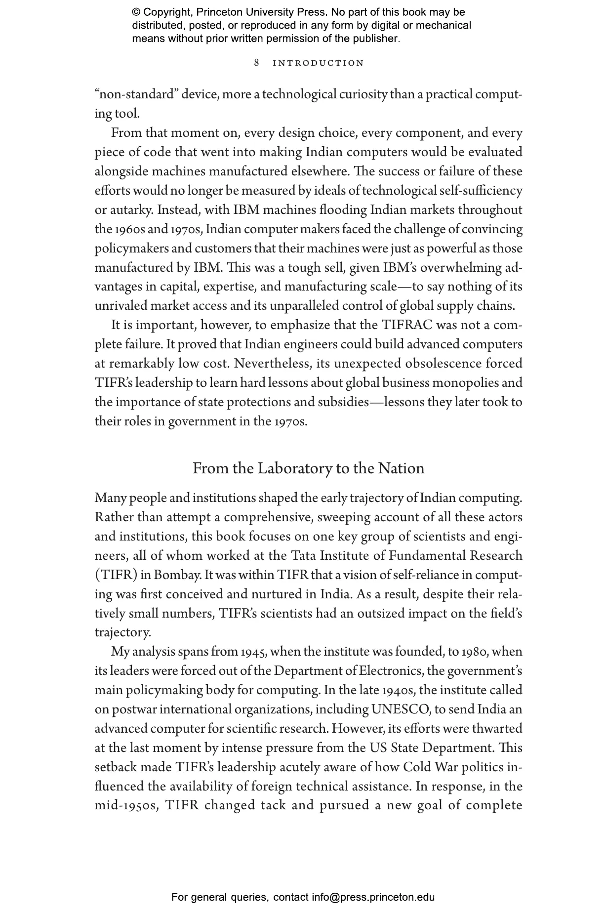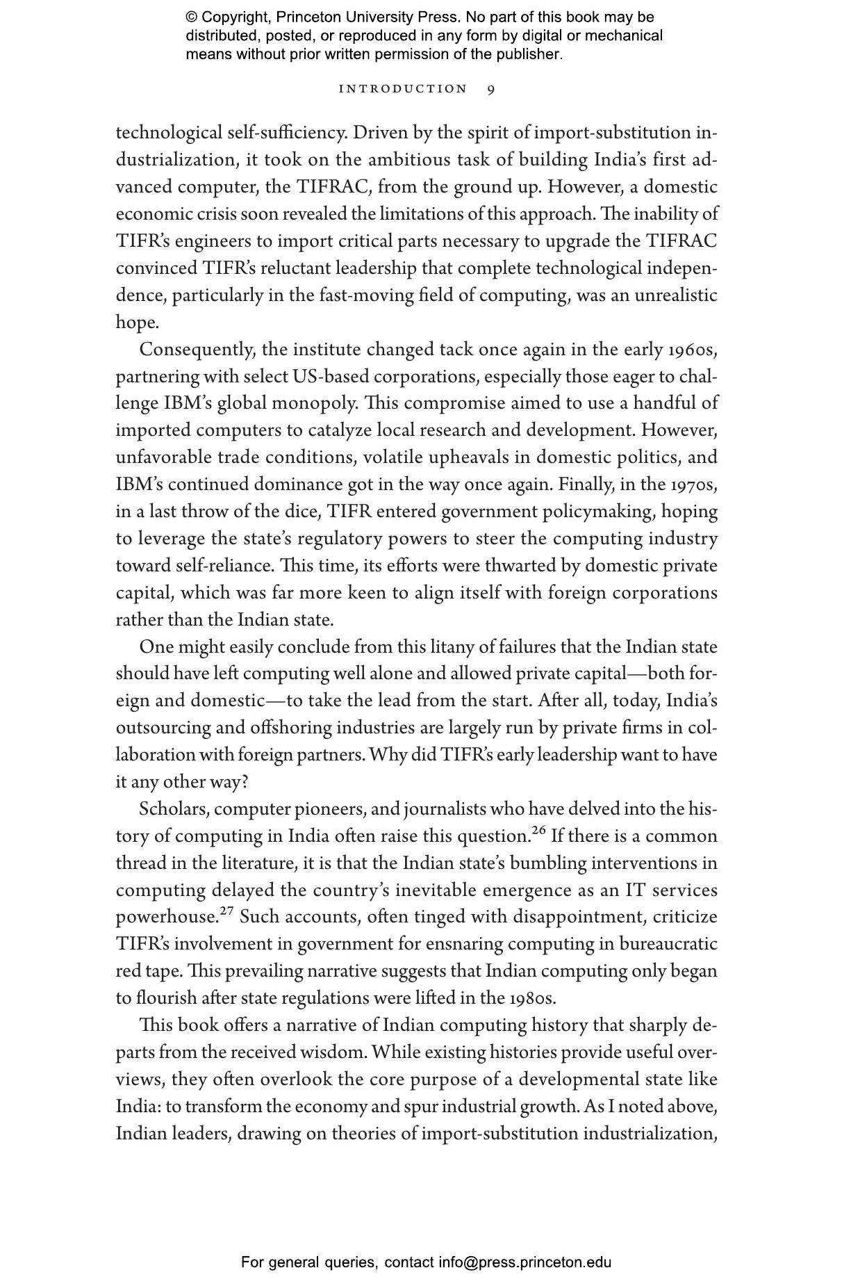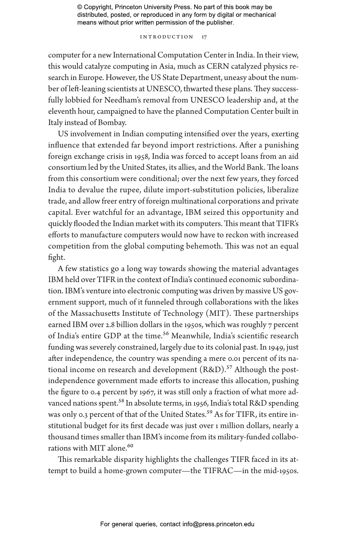 After independence in 1947, Indian scientists and policymakers at institutions such as the Tata Institute of Fundamental Research saw computing as central to national sovereignty, economic growth, and scientific advancement. Through projects such as the groundbreaking TIFRAC computer and the decisive expulsion of IBM, they aimed for technological independence. But almost immediately, these initiatives faced powerful political and economic headwinds. Indian computer scientists grappled with Cold War politics, international trade imbalances, US corporate monopolies, and strategic decisions by India’s technocratic elite, who favored profitable technical services over costly investments in research and manufacturing.