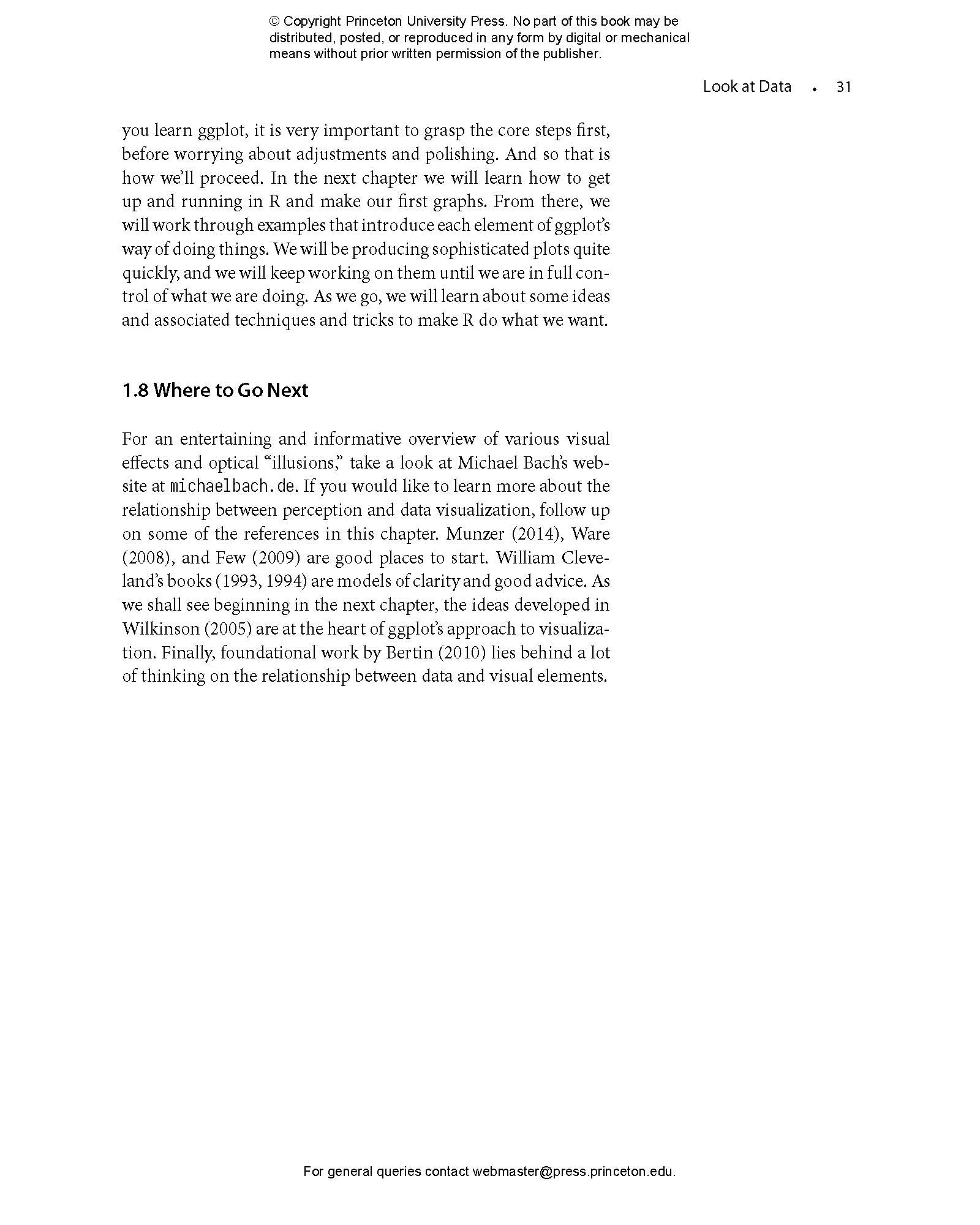 Data Visualization builds the reader鈥檚 expertise in ggplot2, a versatile visualization library for the R programming language. Through a series of worked examples, this accessible primer then demonstrates how to create plots piece by piece, beginning with summaries of single variables and moving on to more complex graphics. Topics include plotting continuous and categorical variables; layering information on graphics; producing effective 鈥渟mall multiple鈥 plots; grouping, summarizing, and transforming data for plotting; creating maps; working with the output of statistical models; and refining plots to make them more comprehensible.