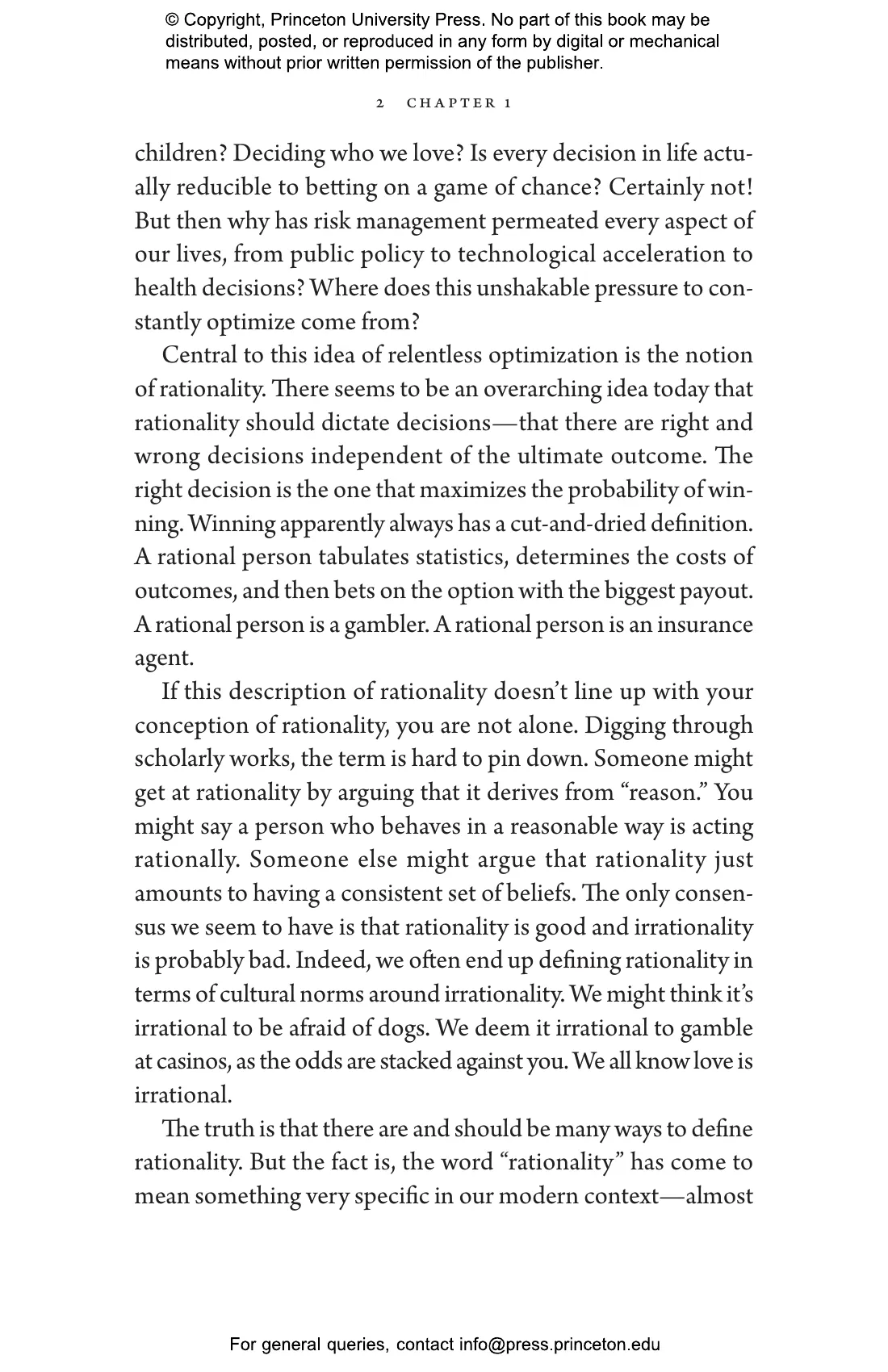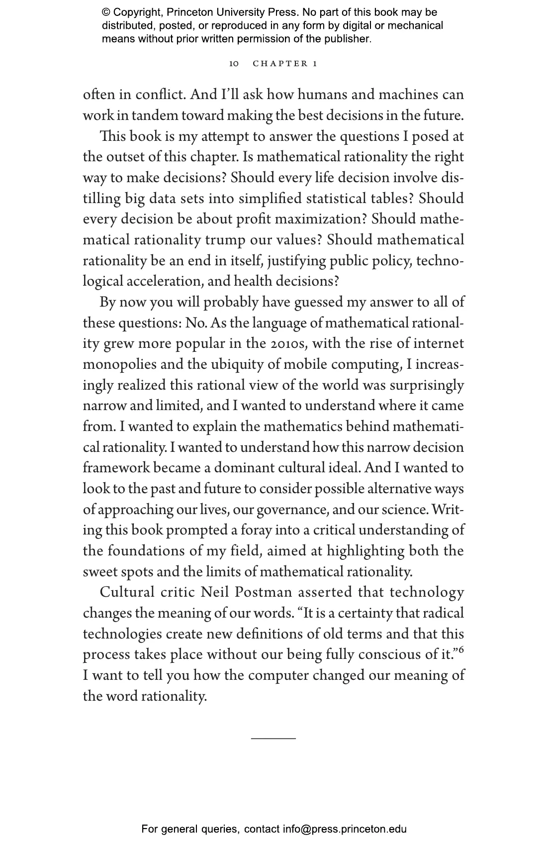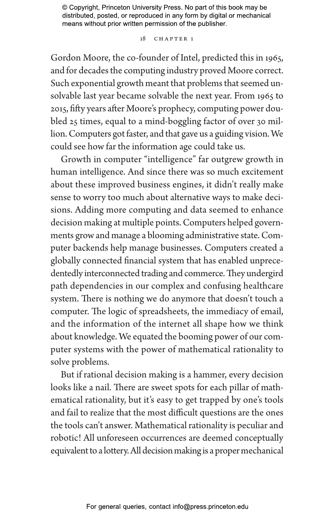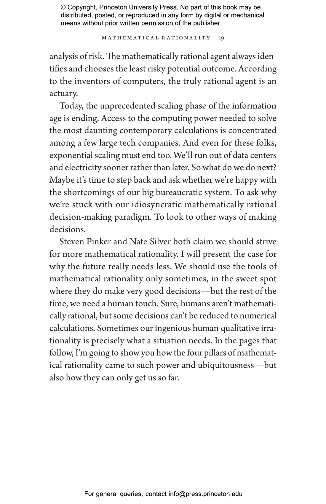 “Recht takes us on an entertaining and refreshingly insightful journey, explaining why we should use mathematical marvels as mechanisms and not masters. He reminds us that we humans are not computers, and that our lives are not there to be optimized, experimented with, strategized over, or reduced to an amalgamation of data points. At a time when AI’s momentum is blazing hot, The Irrational Decision is a cool-headed call to arms for us to take back control, one we should all heed and act on.”—Matt Jones, Chief Operating Officer, Responsible AI UK