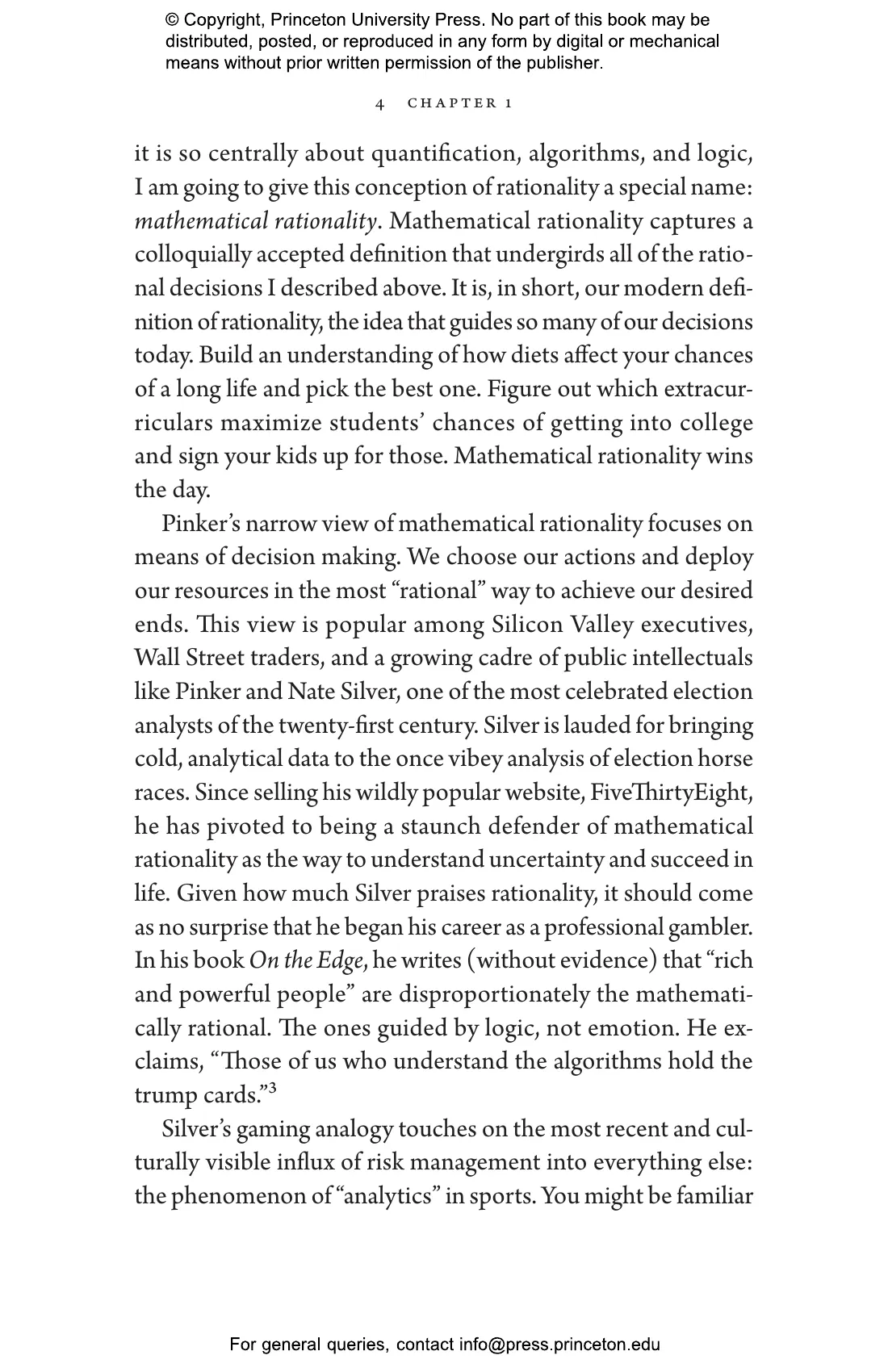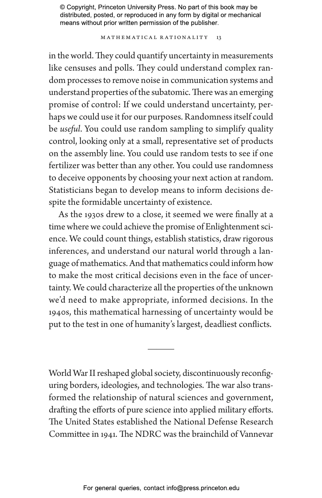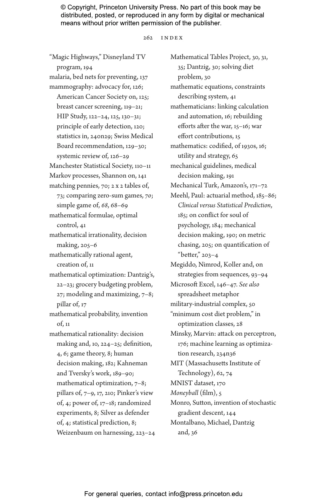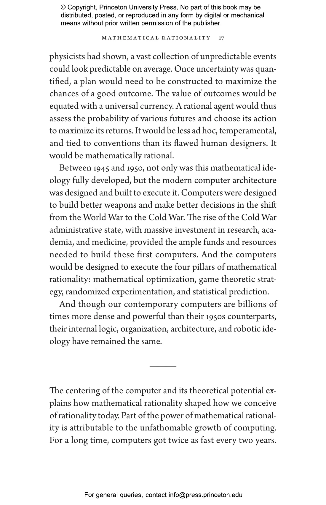 While mathematical rationality has proven valuable in accelerating computers, regulating pharmaceuticals, and deploying electronic commerce, it fails to solve messy human problems and has given rise to a view of a rational world that is not only overquantified but surprisingly limited. Recht shows how these mathematical methods emerged from wartime research and influenced fields ranging from economics to health care, drawing on illuminating examples ranging from diet planning to chess to self-driving cars.