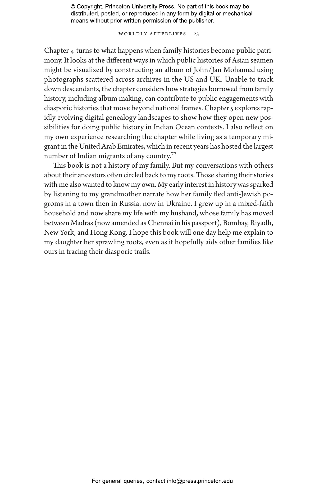 “Through an innovative and capacious approach in archives that includes photographs, oral histories, Facebook pages, Instagram posts, and more conventional official documents, Stephens’s Worldly Afterlives shows how migrants from the Indian subcontinent spread across the world, forming new genealogies and attachments and documenting their rich and complicated lives. A brilliant model for multimedia research and an inspiring example of how historians can write about families now.”—Durba Ghosh, author of Sex and the Family in Colonial India: The Making of Empire