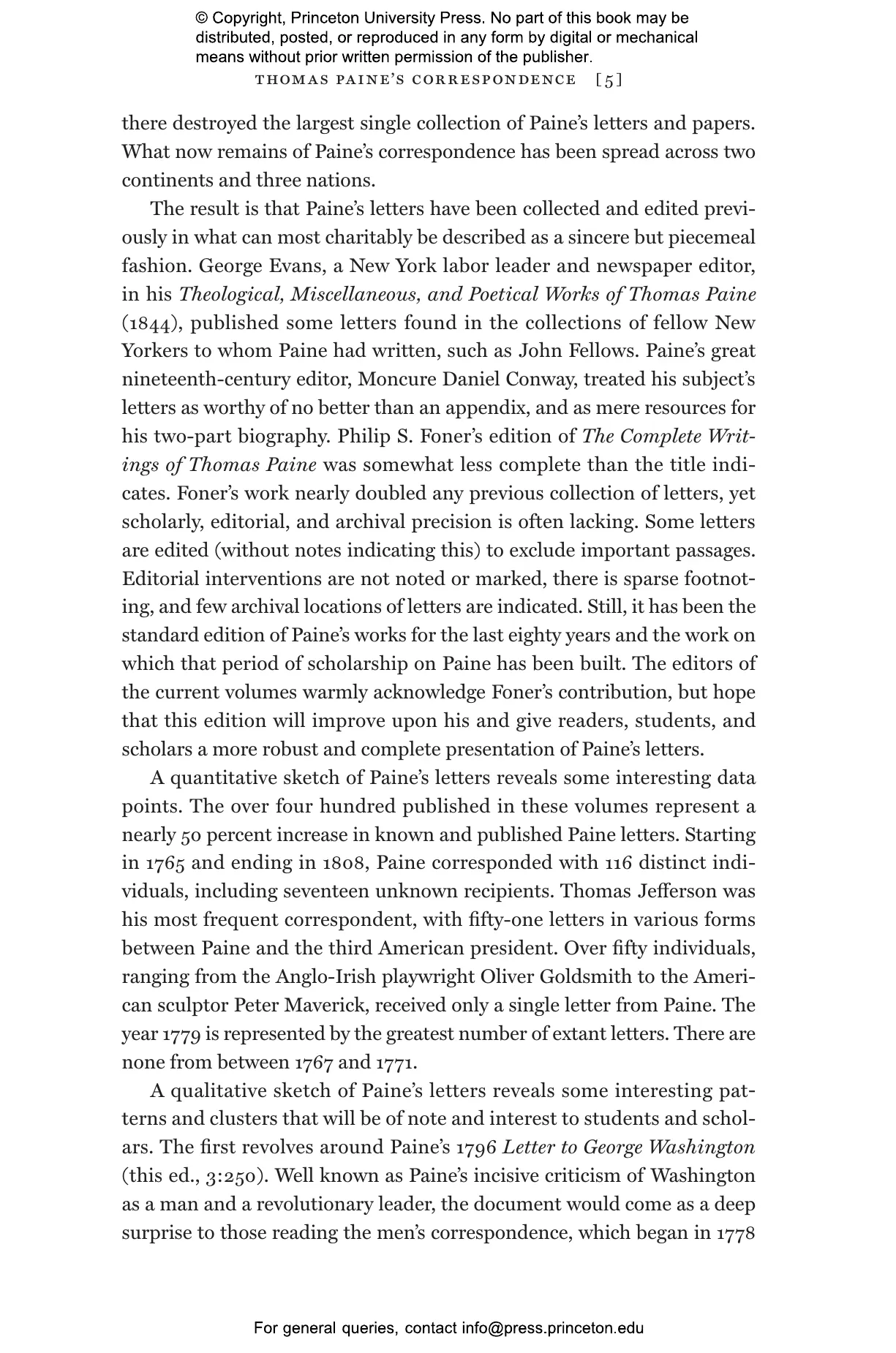 Thomas Paine: Collected Writings is the first major new edition of Paine’s works, bringing together all his writings in six breathtaking volumes that dramatically revise our previous understanding of his activities as a writer and his importance as a democratic theorist in the age of revolutions. It includes about 180 new letters and some two hundred works newly attributed to Paine, with twenty-nine works previously regarded as Paine’s being deattributed. Drawing on pioneering computerized text analysis that makes possible for the first time attributions of anonymous and pseudonymous texts, this collection includes in volumes 5–6 newly identified pamphlets and newspaper and journal contributions, and suggests that Paine was extremely active as a Grub Street oppositional Whig writer in the decade prior to the American Revolution. Many writings from the period of his residence in France (1792–1802) and his subsequent return to the United States are also restored to his published output. Paine emerges as a much more consistent and serious democratic theorist than is often assumed, whose contributions to revolutionary debates in America, Britain, and France were unparalleled in their time.