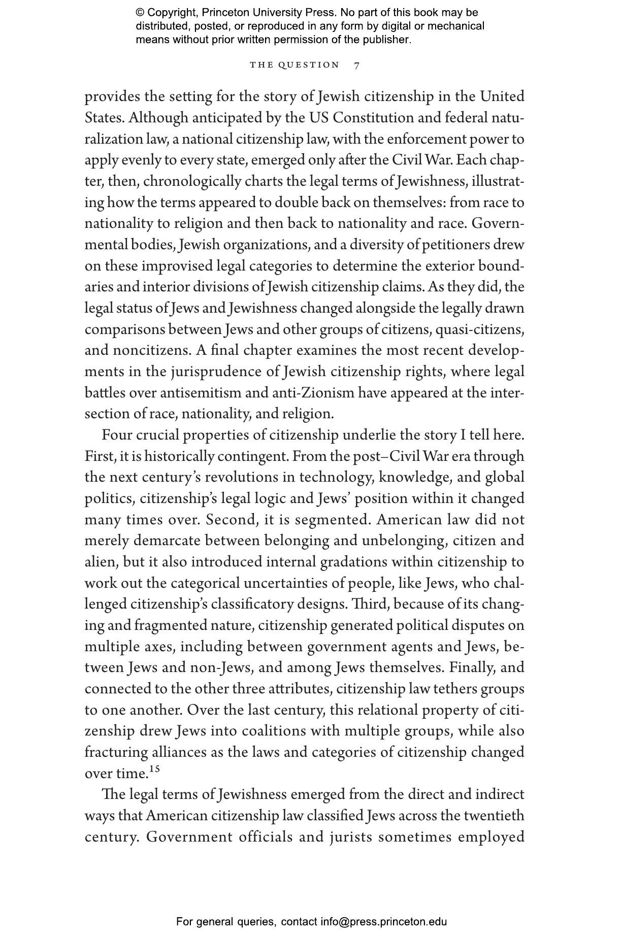 The history of Jews in the United States is often told as if they immigrated, gained citizenship, and almost immediately achieved full legal rights. Yet this story fundamentally misses how citizenship rights worked for Jews and countless others who arrived on American shores. In Who Is American? Lila Corwin Berman draws on case law, statutes, and debates to argue that both the laws of American citizenship and Jews’ position in them changed repeatedly across the twentieth century. Courts, policymakers, and the public persistently asked what it meant to be Jewish under the law. Were Jews a race, a nationality, a religion—or some combination of each? The answer carried profound legal consequences. Not only did it determine Jews’ citizenship status, but it also affected the rights they could exercise. Just as significantly, the meaning of the categories under law changed over time, affecting Jews’ self-understanding, their political ideals, and their relationships to other groups of Americans.