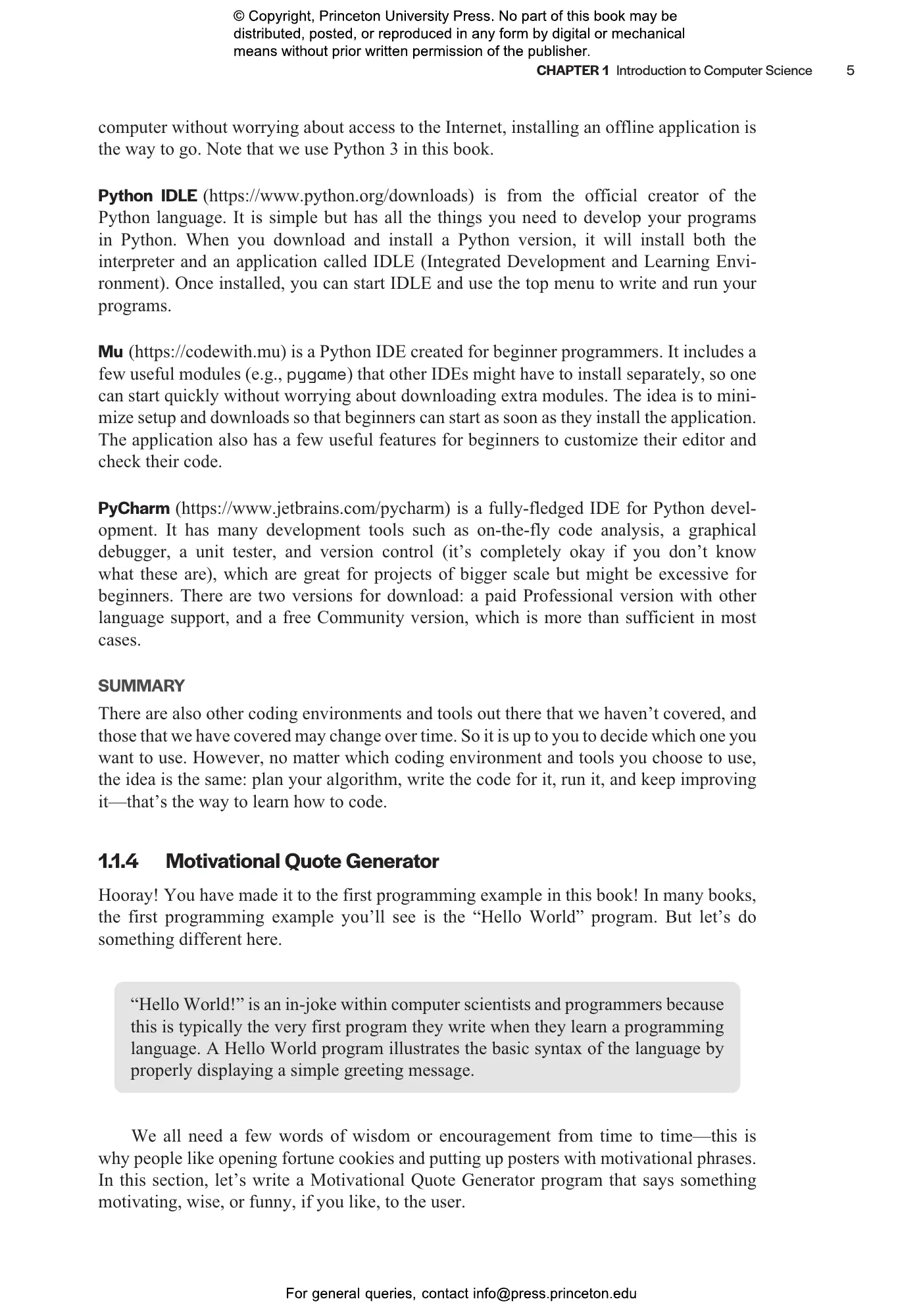 “This book encourages students to get their hands dirty—to start programming and playing with code on day one. There is a nice narrative flow that introduces a task and then introduces more Python to enable students to accomplish enhancements to the initial task. The tone is welcoming and encouraging—you can feel the energy of the authors in the text.”—Anne Bracy, Cornell University
