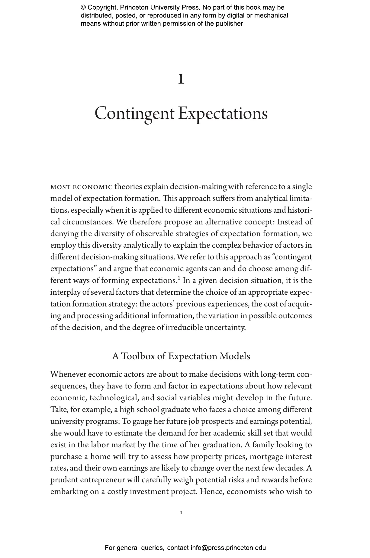Expectations play a crucial role in shaping economic behavior. But how are expectations actually formed, and how has this changed over time? The financial crisis of 2007–08 cast doubt on traditional theories of expectation formation, particularly the rational expectations framework. In Contingent Expectations, Alexander Nützenadel and Jochen Streb examine the ways that past experiences influence the economic expectations and decision-making of households, investors, and policymakers through history, and offer an alternative perspective. Combining a comprehensive empirical analysis of expectation formation from the eighteenth century to the present day with an assessment of the relevant economic theory, Nützenadel and Streb present a new theoretical framework, contingent expectations, for understanding economic expectation.