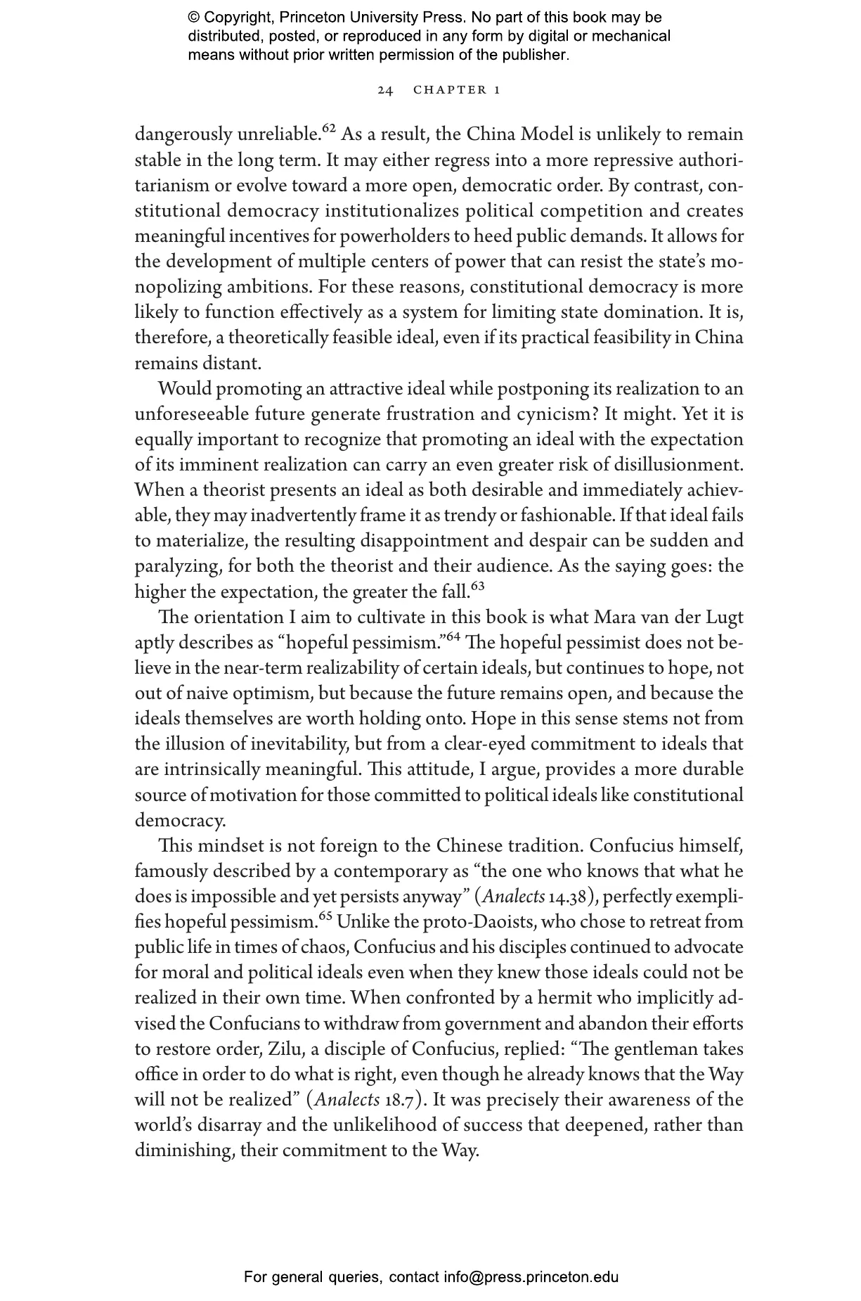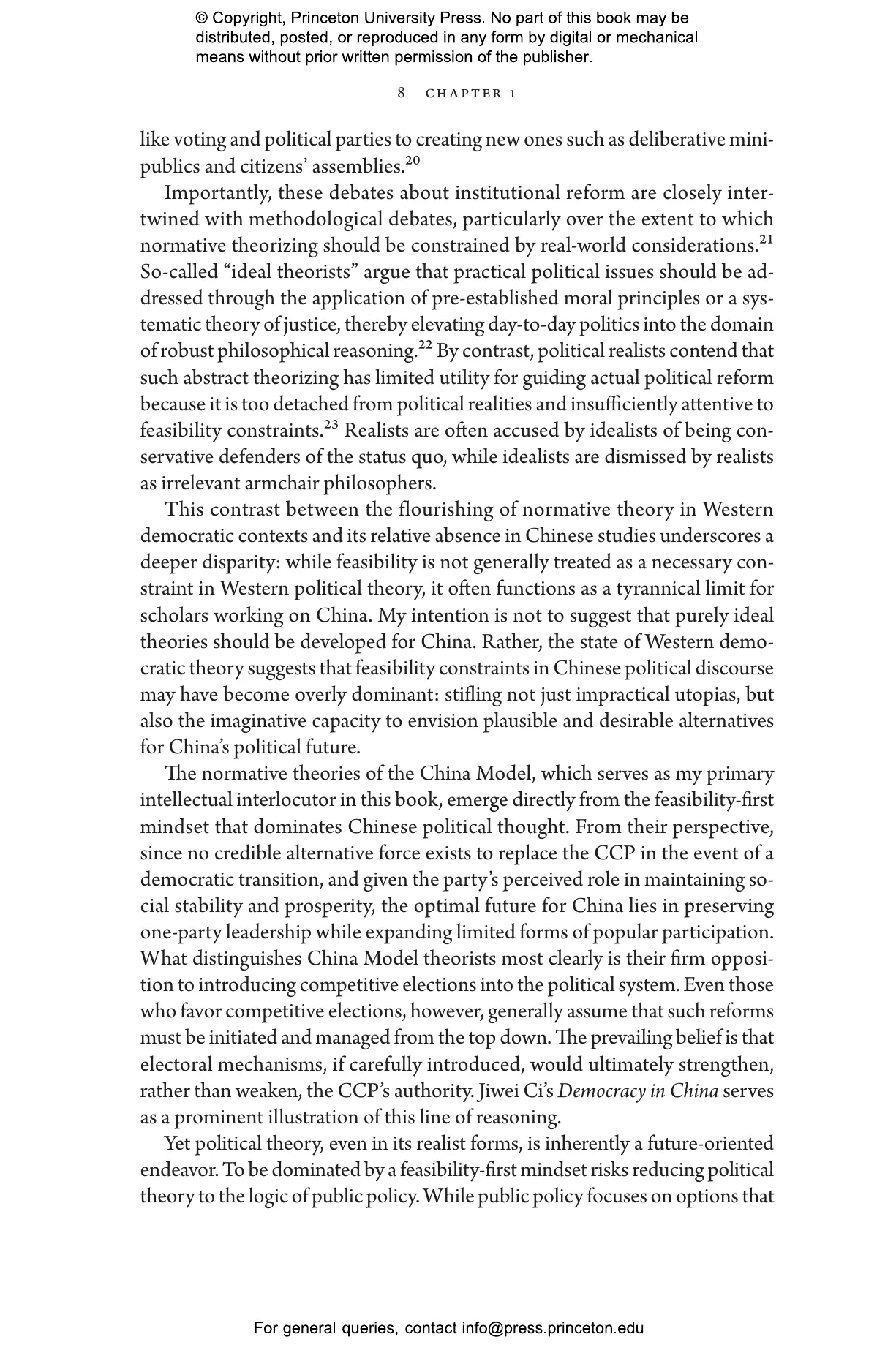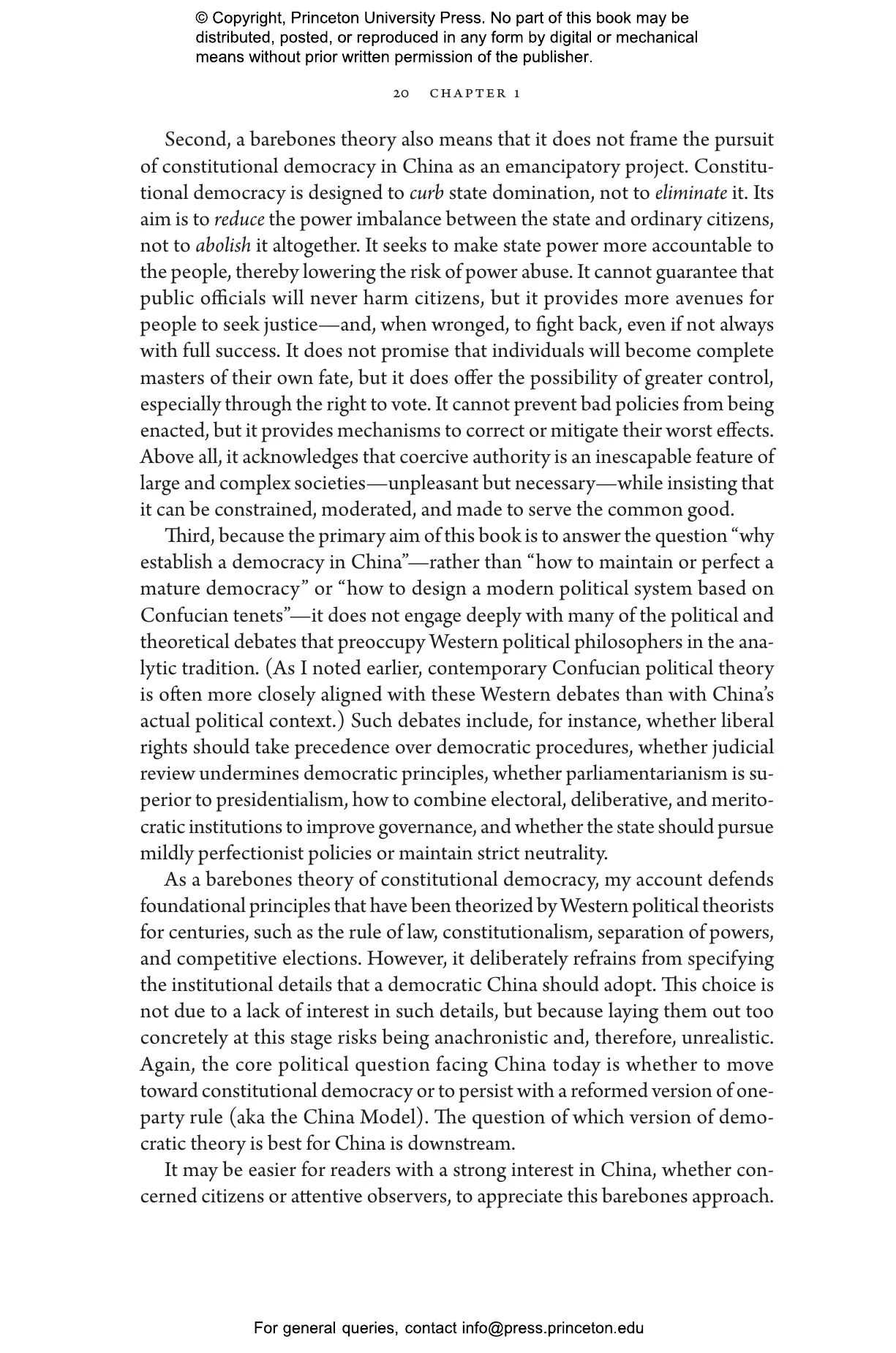 Jiang shows that the China Model fails on two realist grounds: it places unwarranted faith in the willingness of China鈥檚 leadership to liberalize and share power with citizens; and even with limited power-sharing, the system would be unable to address one of China鈥檚 deepest problems鈥攖he state鈥檚 unchecked domination over ordinary people. For all its flaws, constitutional democracy remains an indispensable framework for limiting the state鈥檚 authoritarian overreach. Jiang argues that when realism is understood in a more expansive, historically grounded way鈥攏ot simply as short-term political feasibility鈥攃onstitutional democracy in China can be seen to be a realistic and necessary path forward over the long term.