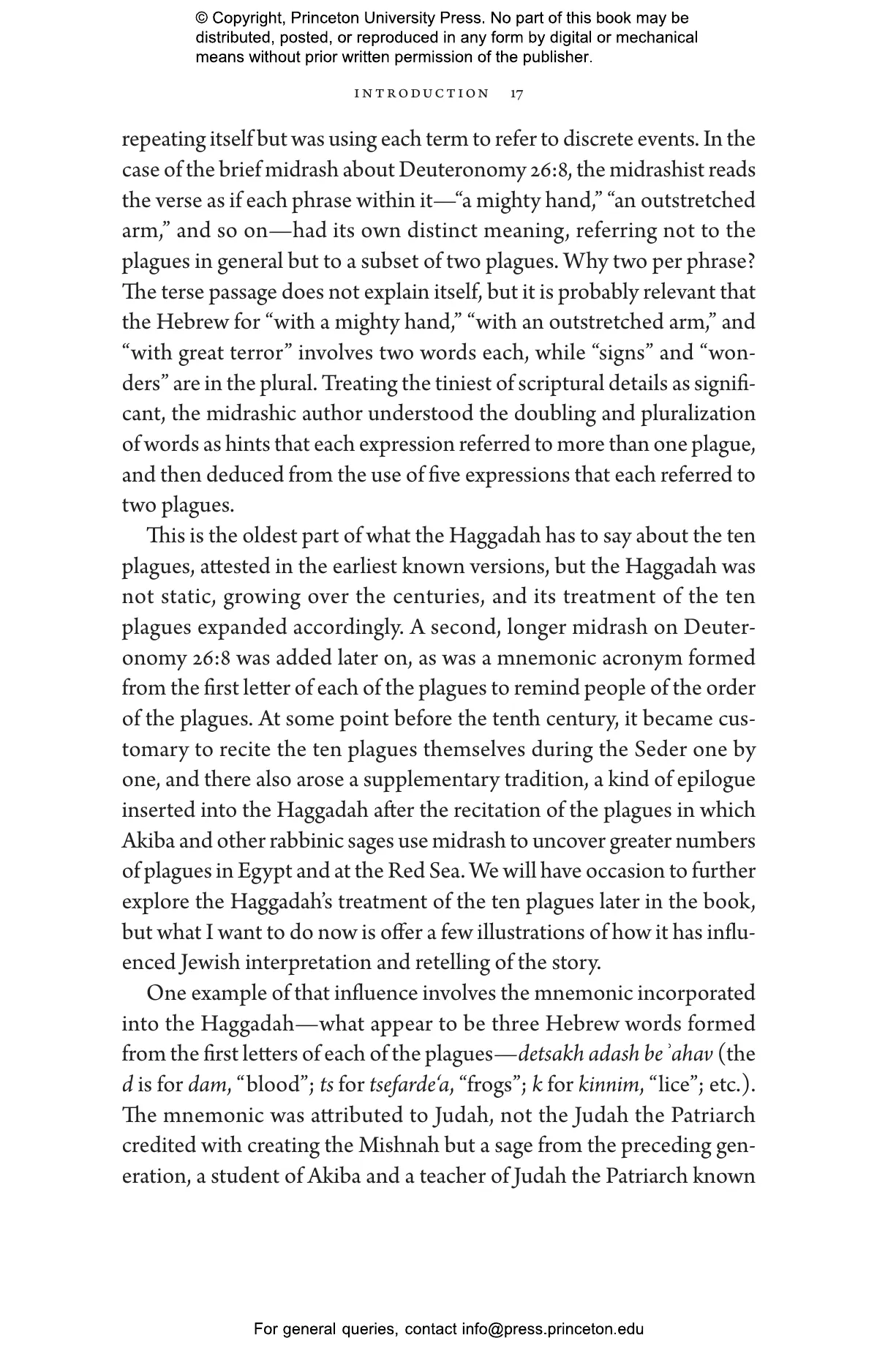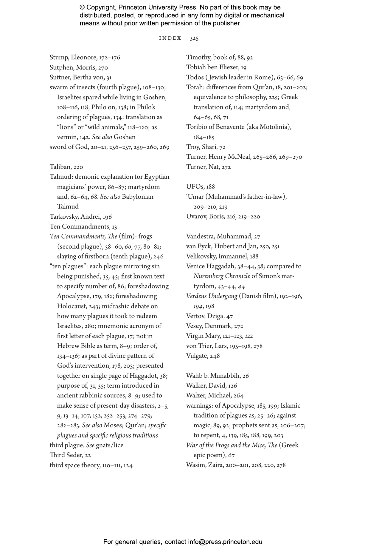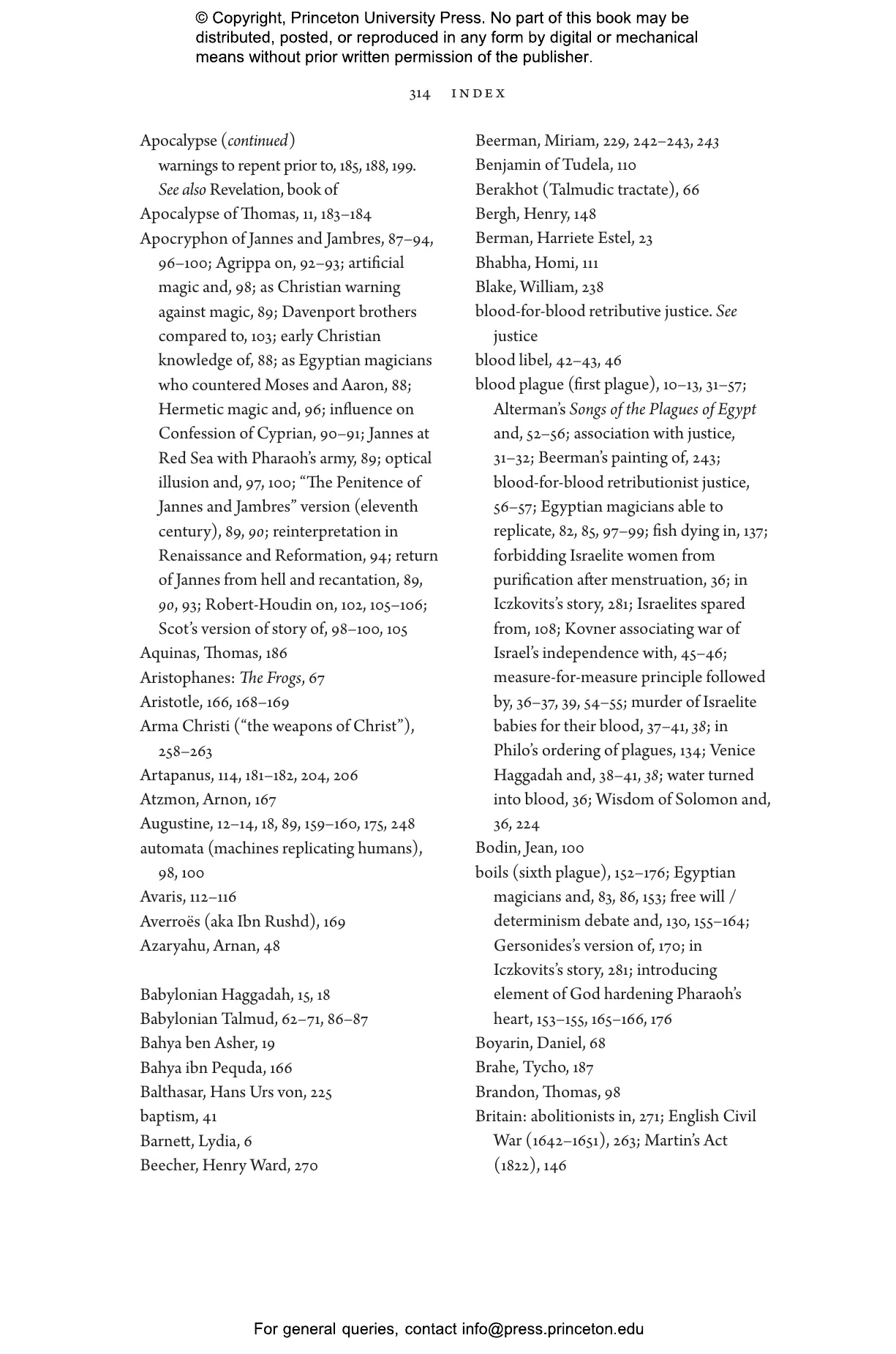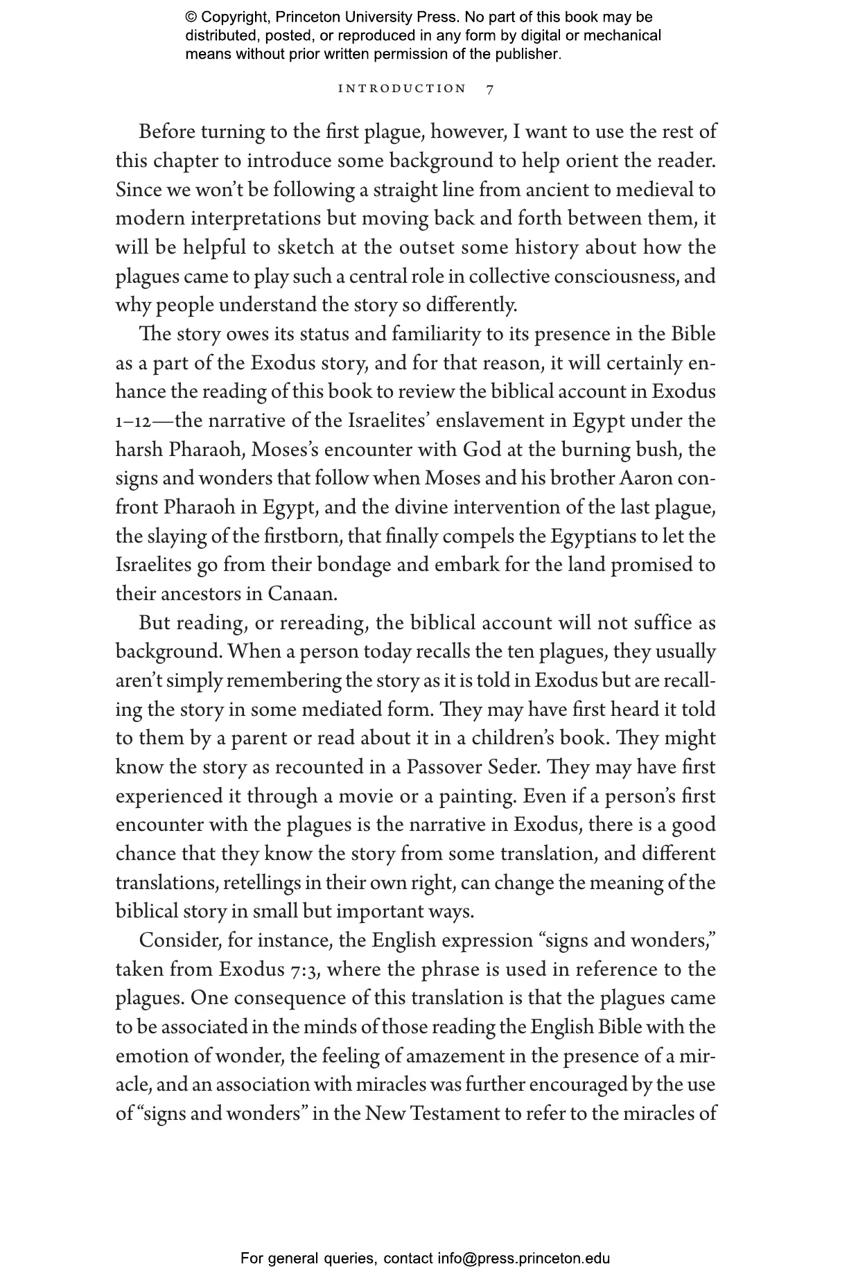 “A bracing read whose pages encompass themes as varied as animal rights and meteorology, science fiction and the art of storytelling, this imaginatively argued and generously illustrated account showcases the ways in which the ten plagues figure as critical flashpoints in understanding human nature. Thanks to its novel and abundant insights, you won’t think of the biblical narrative in quite the same way ever again.”—Jenna Weissman Joselit, author of Set in Stone: America’s Fascination with the Ten Commandments