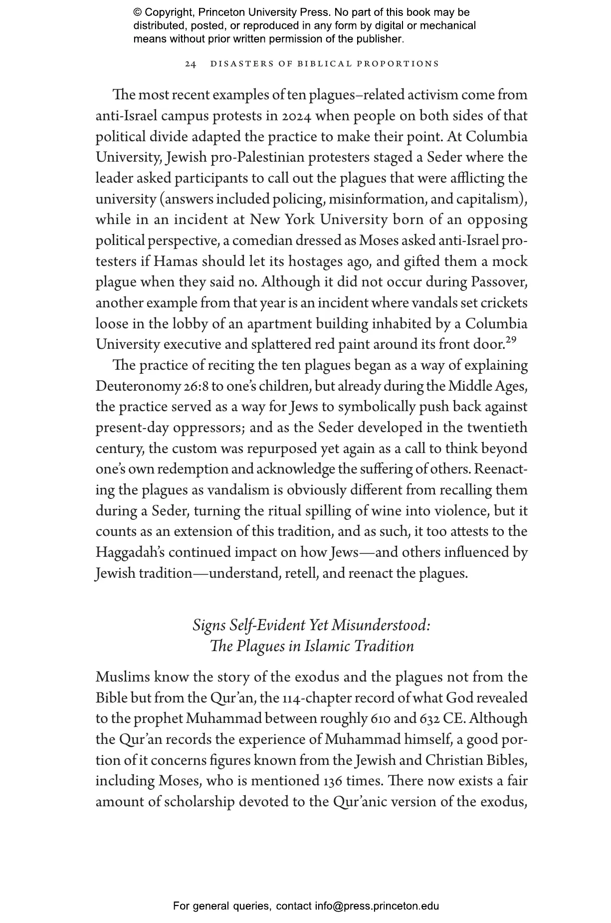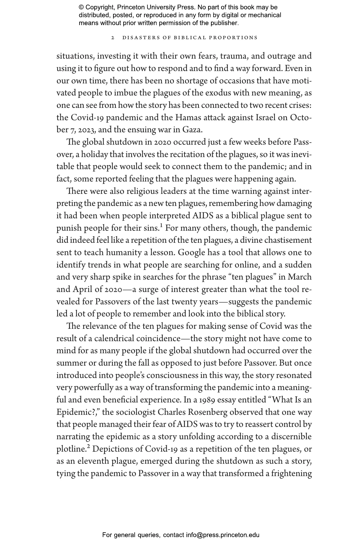 The story of the ten plagues resonates today, as we try to make sense of such calamities of modern life as pandemics, climate change, and war. In Disasters of Biblical Proportions, Steven Weitzman explores how people of later ages—artists, writers, activists, philosophers, believers and unbelievers alike—have reshaped the story of the ten plagues to give expression to their own trauma, outrage, guilt, humor, and hope.