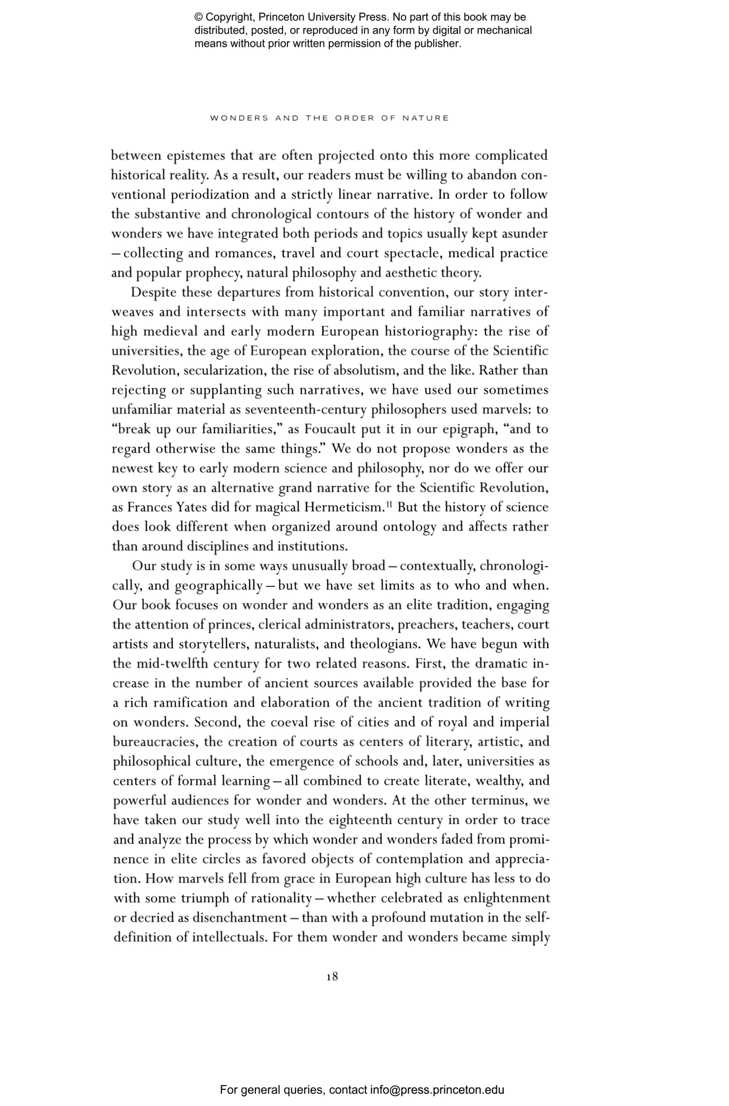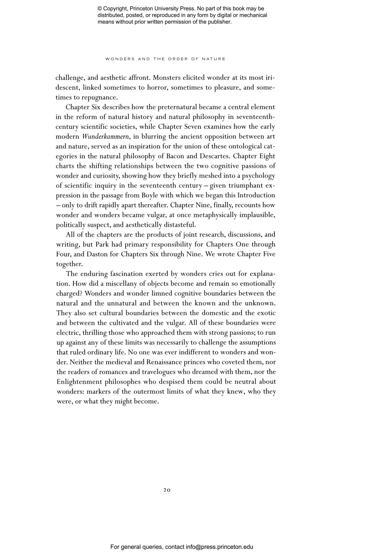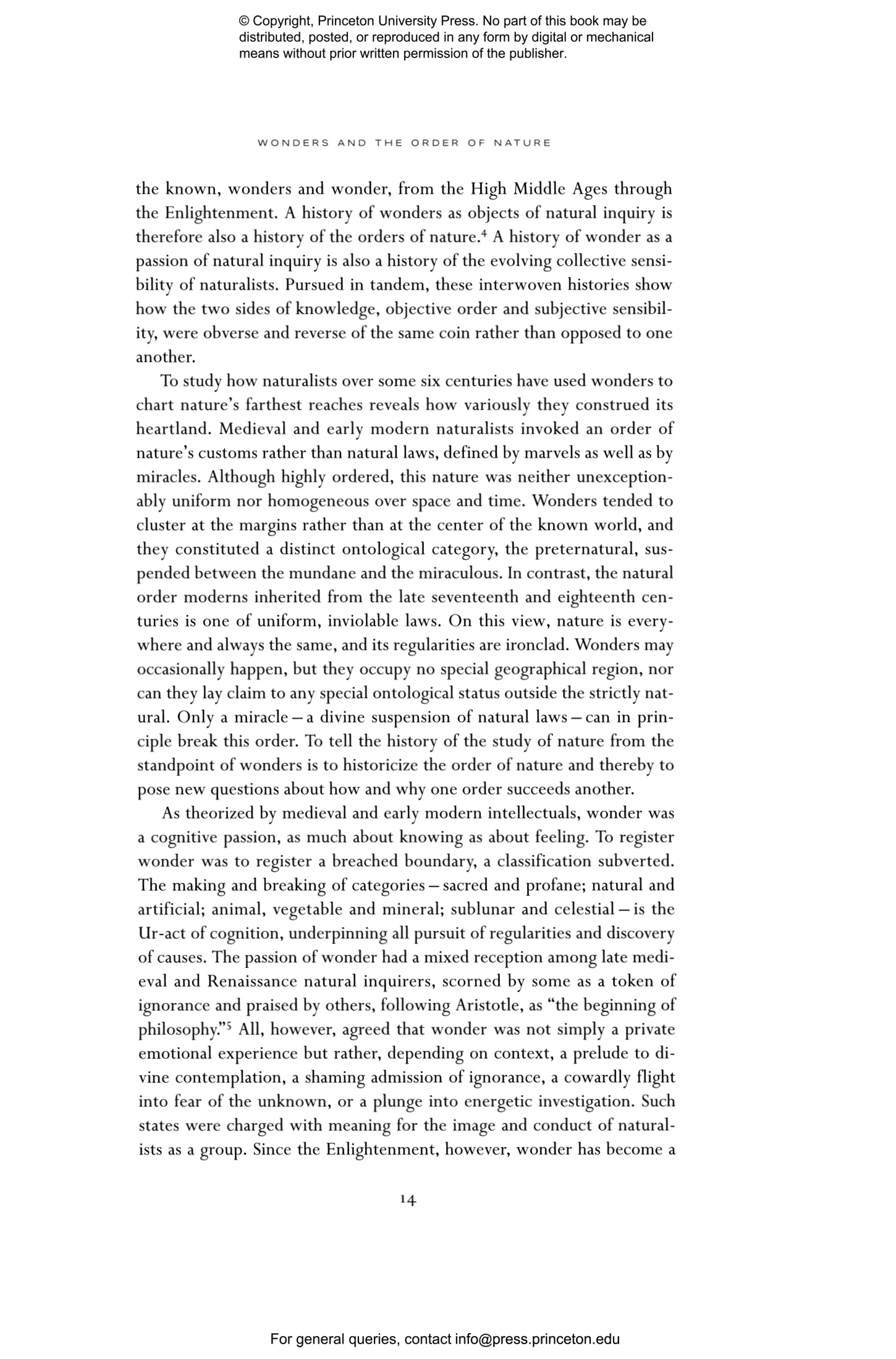 Wonders and the Order of Nature is about the ways in which European naturalists from the High Middle Ages through the Enlightenment used wonder and wonders, the passion and its objects, to envision themselves and the natural world. Monsters, gems that shone in the dark, petrifying springs, celestial apparitions — these were the marvels that adorned romances, puzzled philosophers, lured collectors, and frightened the devout.