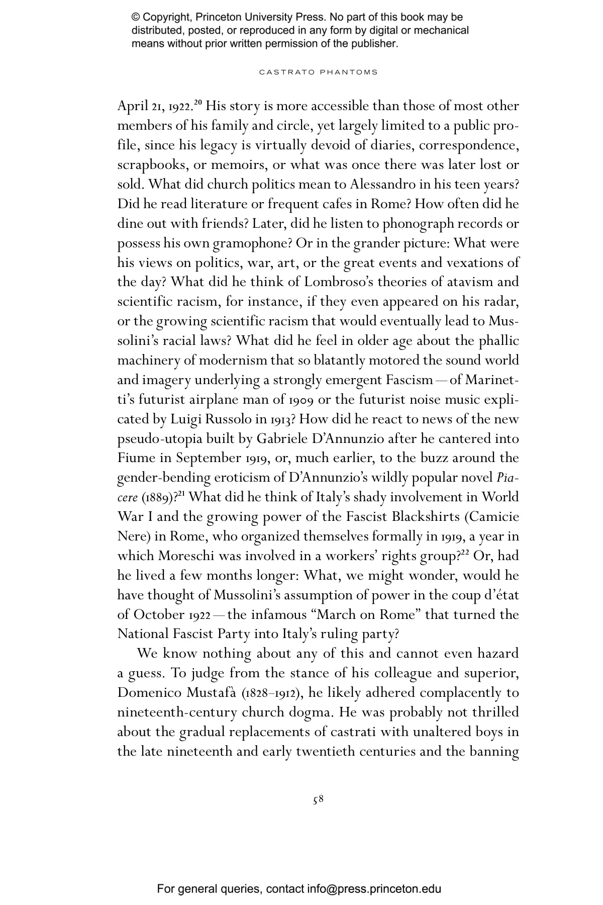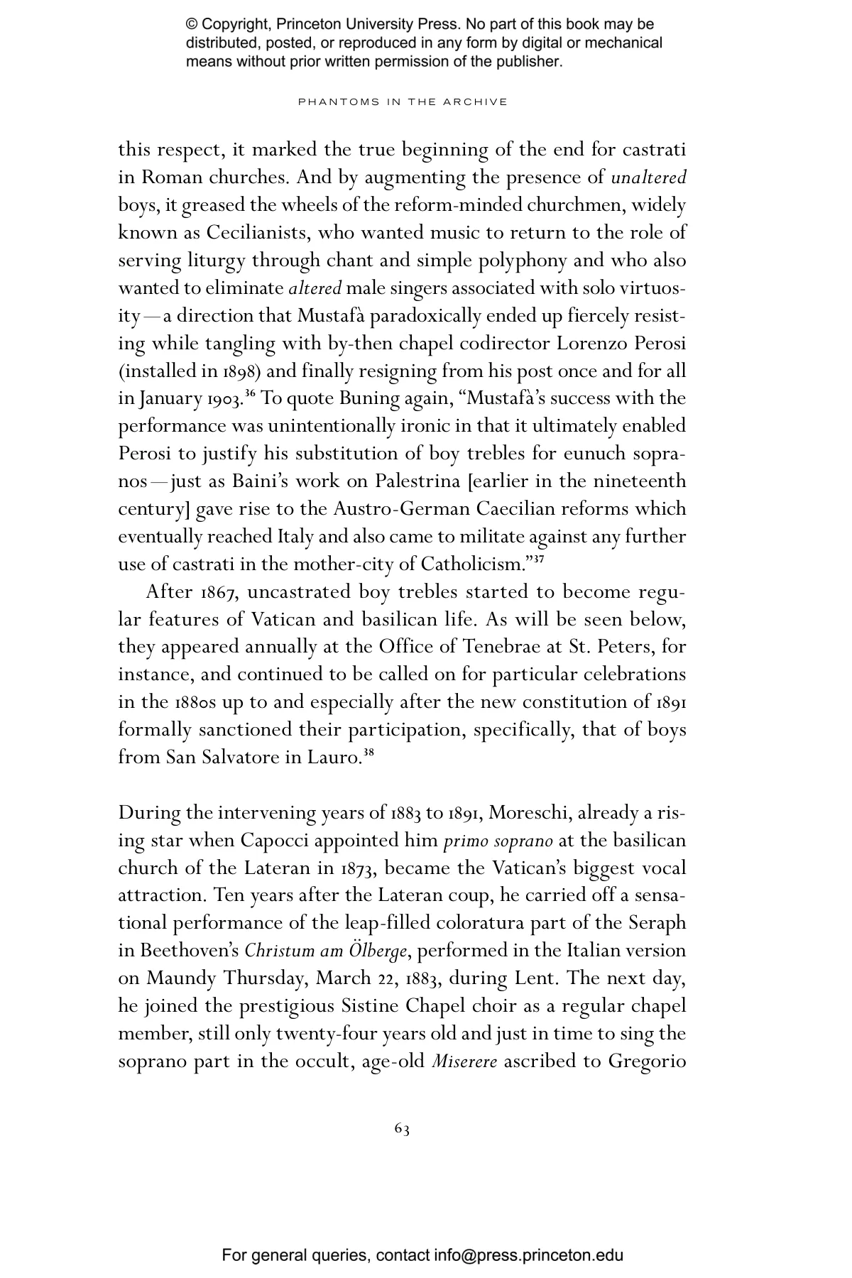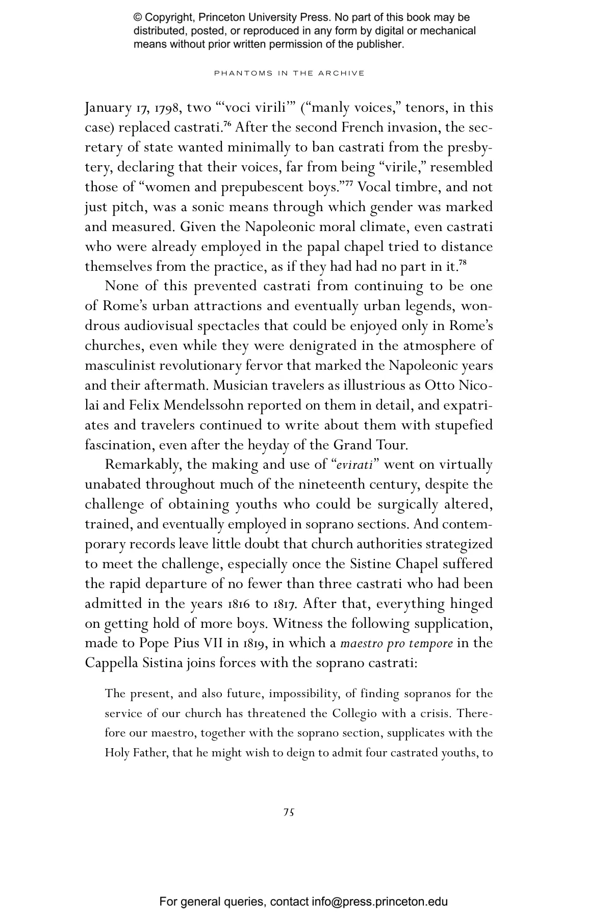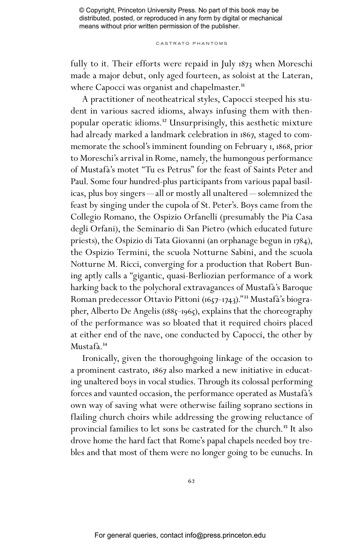 “Castrato Phantoms is microhistory at its best. Feldman’s virtuosic reconstruction of Moreschi’s life deploys the historian’s tools — genealogy, philology, and storytelling — to poetic ends, producing a textured reflection on anachronism and the aporias of time. Refracted in the material traces of Moreschi’s life are the sounds and images of a twilight Vatican still gripping Rome in the form of what Feldman brilliantly calls the ‘sacred vernacular.’ Closely observing relationships between Moreschi and Fellini, Feldman seamlessly weaves the afterlife of opera to the history of film.” —Giorgio Biancorosso, Professor of Music, University of Hong Kong