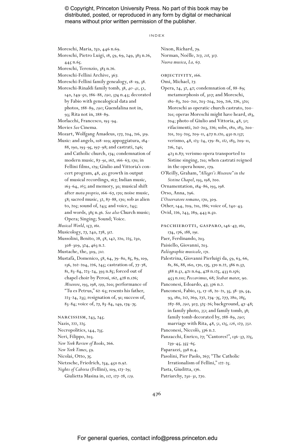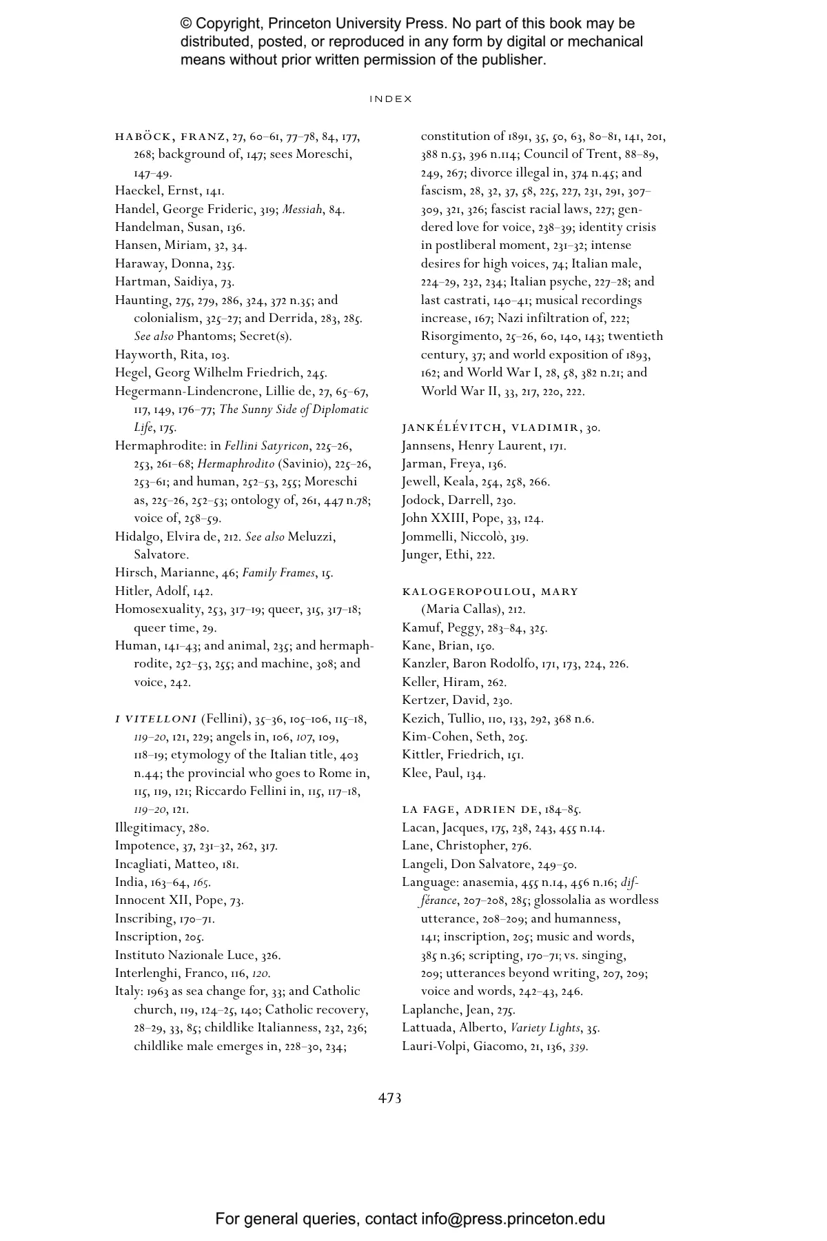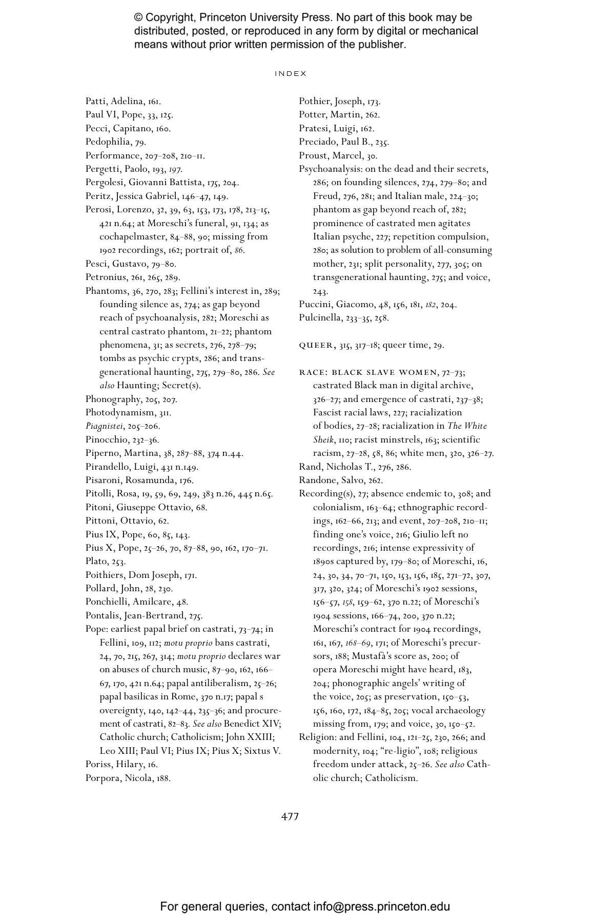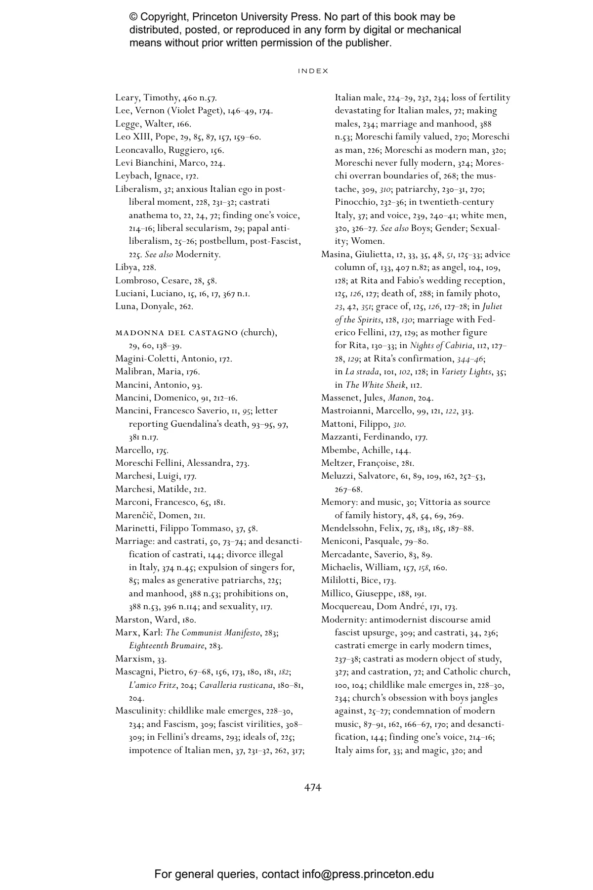 “A book that leaves the reader awestruck. Feldman’s meticulous documentation traces an extended search for connections between the castrato voice and its penumbrae in Italy, from recording technology’s uncanniness to Federico Fellini’s filmic obsessions, from biography to kinship and its meanings, touching on forms taken by the sacred, and extending from centuries past to the present. Feldman has written a non-linear, time-traveling history that departs from a gravitational center—the historical figure of Alessandro Moreschi, ‘the last castrato’—to reach outer orbits in psychoanalysis and the spectral before returning to the icon at its center, then turning outwards again. In this extraordinary and moving tour-de-force, the writing itself is singing.” —Carolyn Abbate, Paul and Catherine Buttenwieser University Professor, Harvard University