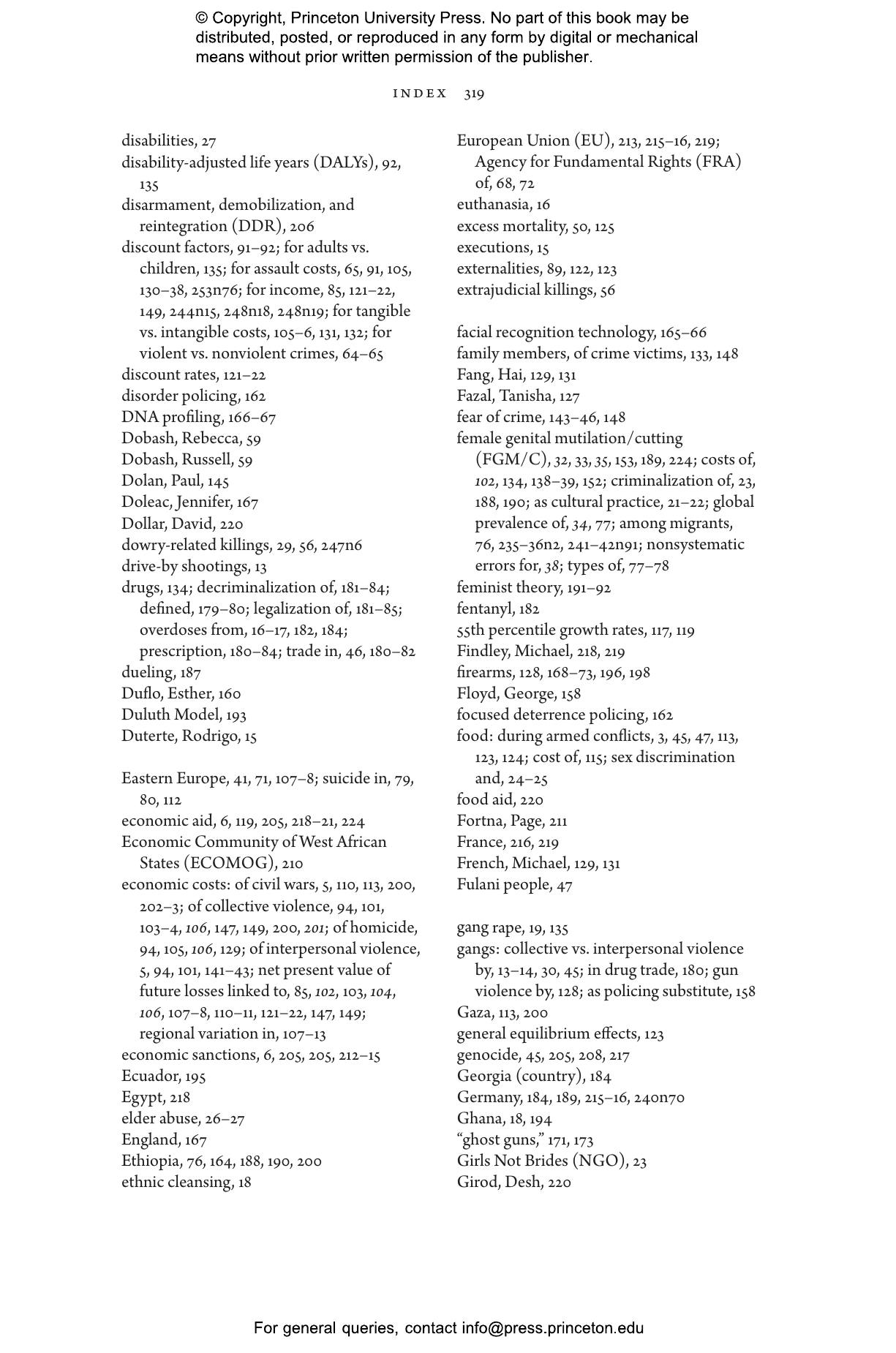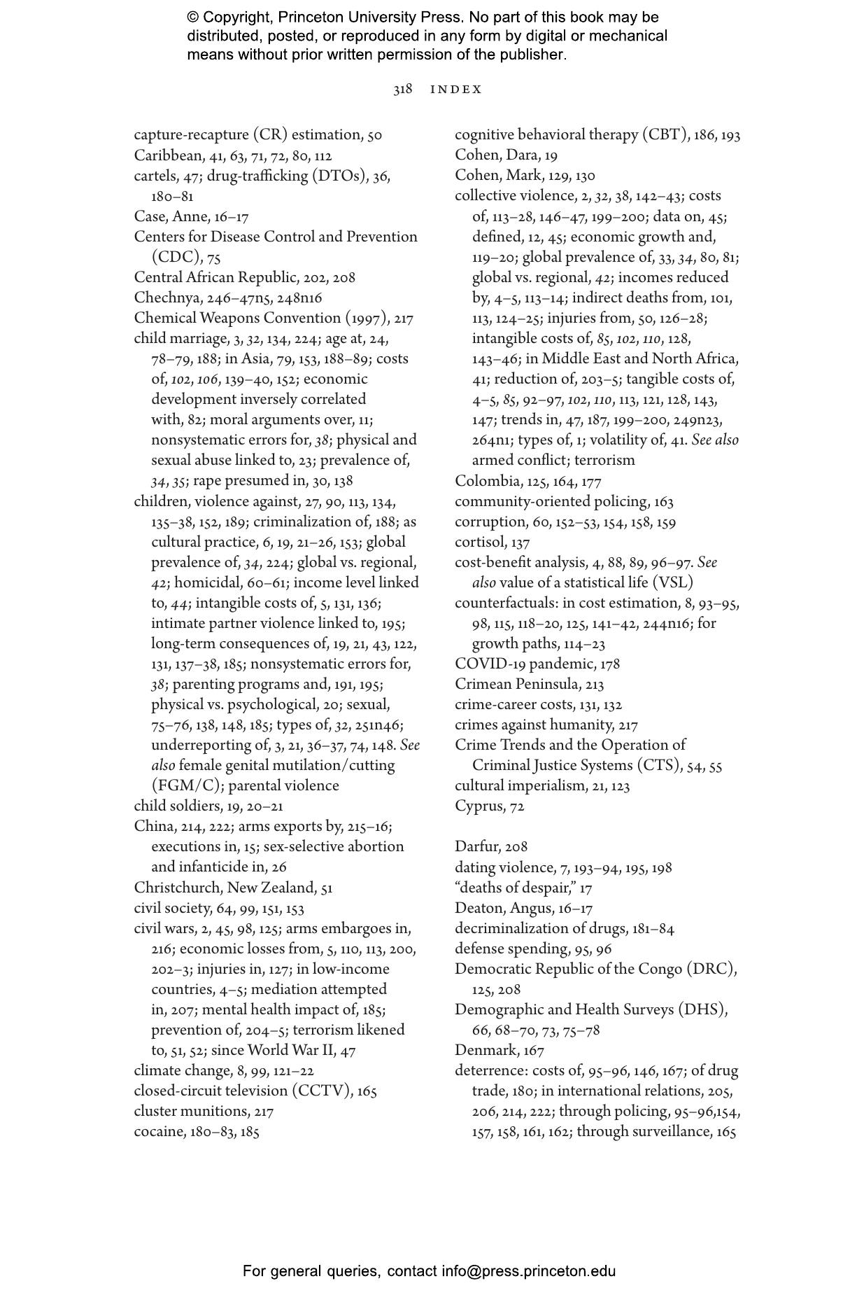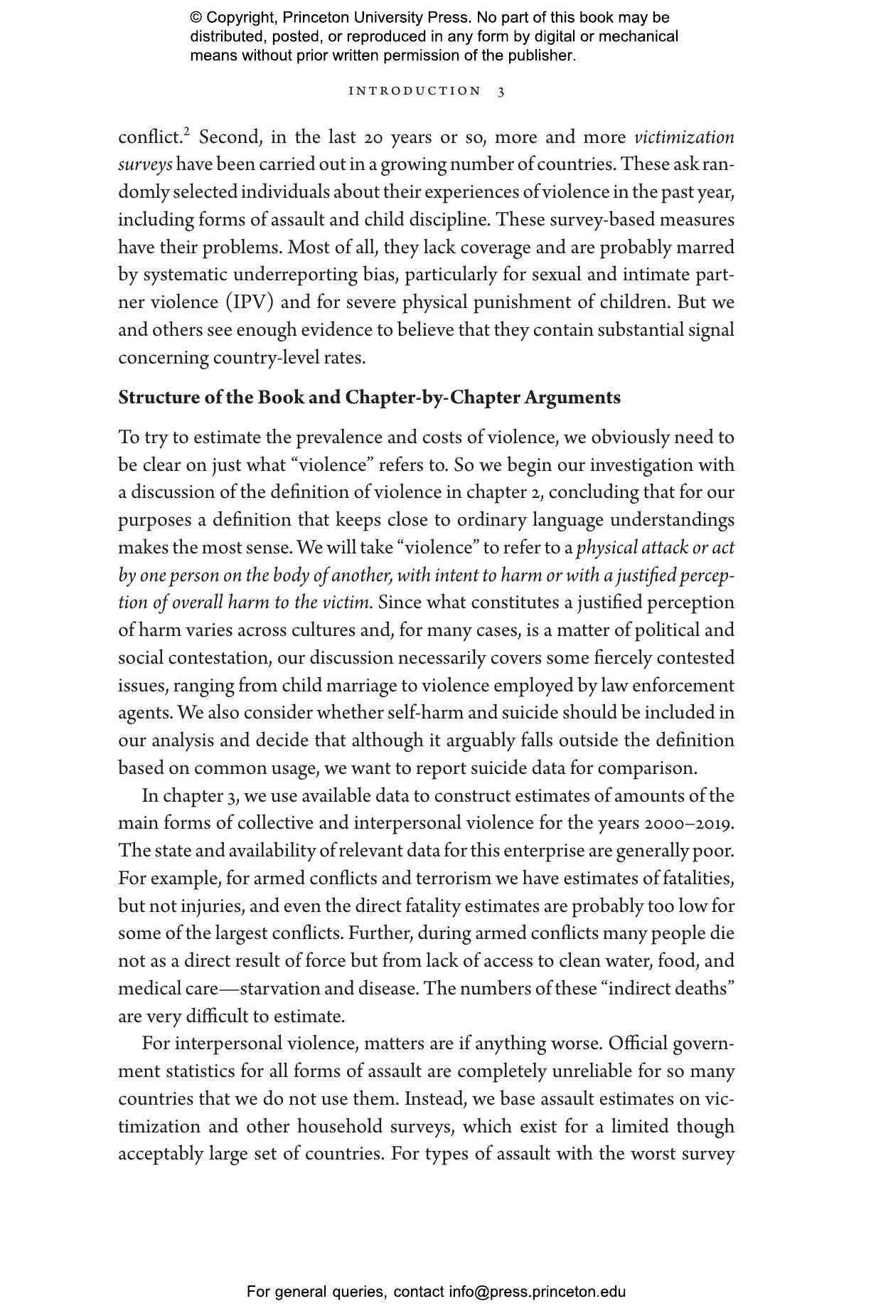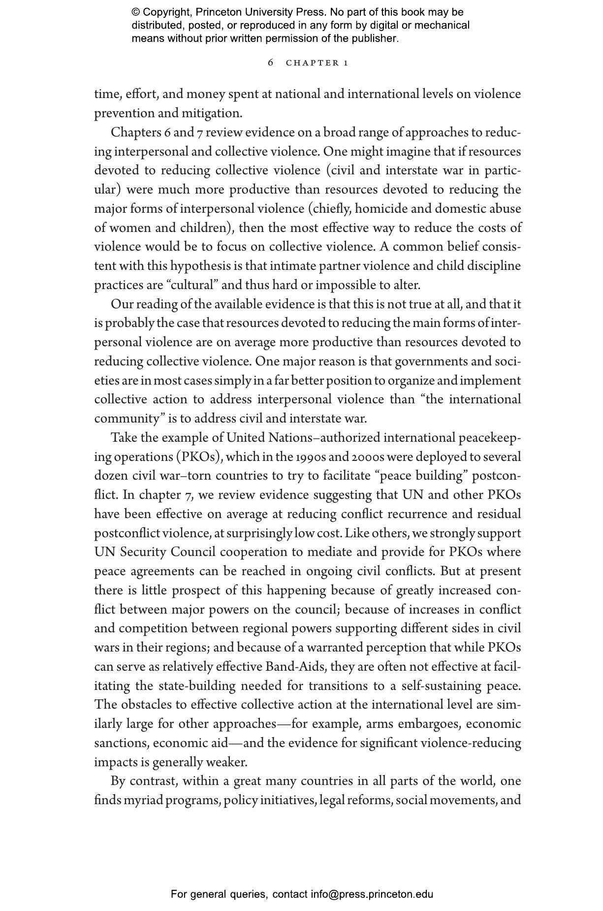 Hoeffler and Fearon argue that high rates of interpersonal violence are not simply fixed by culture or other structural factors. Evidence from a host of program evaluations, natural experiments, and longer-term social movements make it clear that rates of homicide, intimate partner violence, and severe physical punishment of children can be reduced if they are effectively targeted. Interventions that promote peace in civil war鈥搕orn countries are also possible, but the opportunities are few and increasingly far between. Drawing on ideas and methods from many fields鈥攅conomics, political science, public health, psychology, sociology, and others鈥攖he authors show that money and policy efforts directed toward reducing interpersonal violence thus merit higher priority both within countries and by international donors.