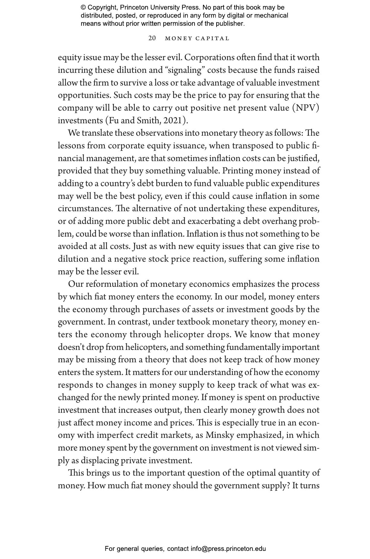 In the financial world, companies issue new shares only if it results in some kind of value creation; this is a basic principle of corporate finance that Bolton and Huang argue can be applied to monetary economics. When the government increases the money supply to finance positive net value investments—when it prints money to keep the economy going—it increases output, not inflation. This is evidenced by the strong growth in GDP and money in China over the last four decades, and in the United States during World War II. The effect of increasing money supply, they argue, depends on how money enters the system and what the money buys. The principles outlined by Bolton and Huang shed new light on a range of issues, including inflation, monetary and fiscal policy, central banking, money and growth, and the international monetary system.