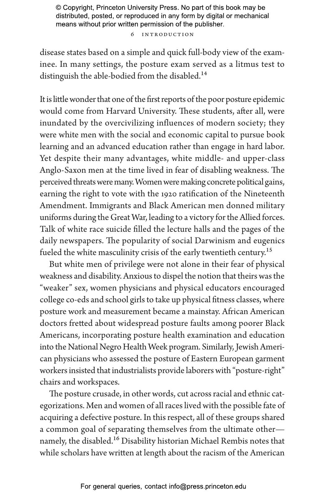 In the early twentieth century, the eugenics movement and fears of disability gave slouching a new scientific relevance. Bad posture came to be seen as an individual health threat, an affront to conventional race hierarchies, and a sign of American decline. What followed were massive efforts to measure, track, and prevent slouching and, later, back pain鈥攃ampaigns that reached schools, workplaces, and beyond, from the creation of the American Posture League to posture pageants. The popularity of posture-enhancing products, such as girdles and lumbar supports, exploded, as did new fitness programs focused on postural muscles, such as Pilates and modern yoga. By 1970, student protests largely brought an end to school posture exams and photos, but many efforts to fight bad posture continued, despite a lack of scientific evidence.