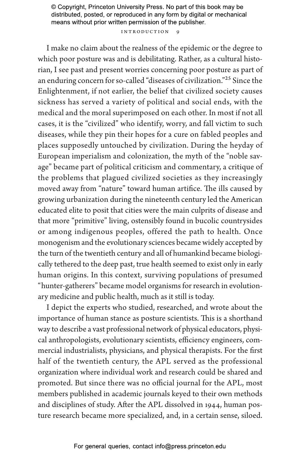 "A long history of anxiety about the proximity between human and bestial nature. . . . Linker traces the history of this concern: from the exchanges of nineteenth-century scientists, who first identified the possible ancestral causes of contemporary back pain, to the late-twentieth-century popularity of the Alexander Technique, Pilates, and hatha yoga. . . . She sees the ‘past and present worries concerning posture’ . . . [are] grounded in a mythology of human ancestry that posits the hunter-gatherer as an ideal from which we have fallen."鈥擱ebecca Mead, The New Yorker