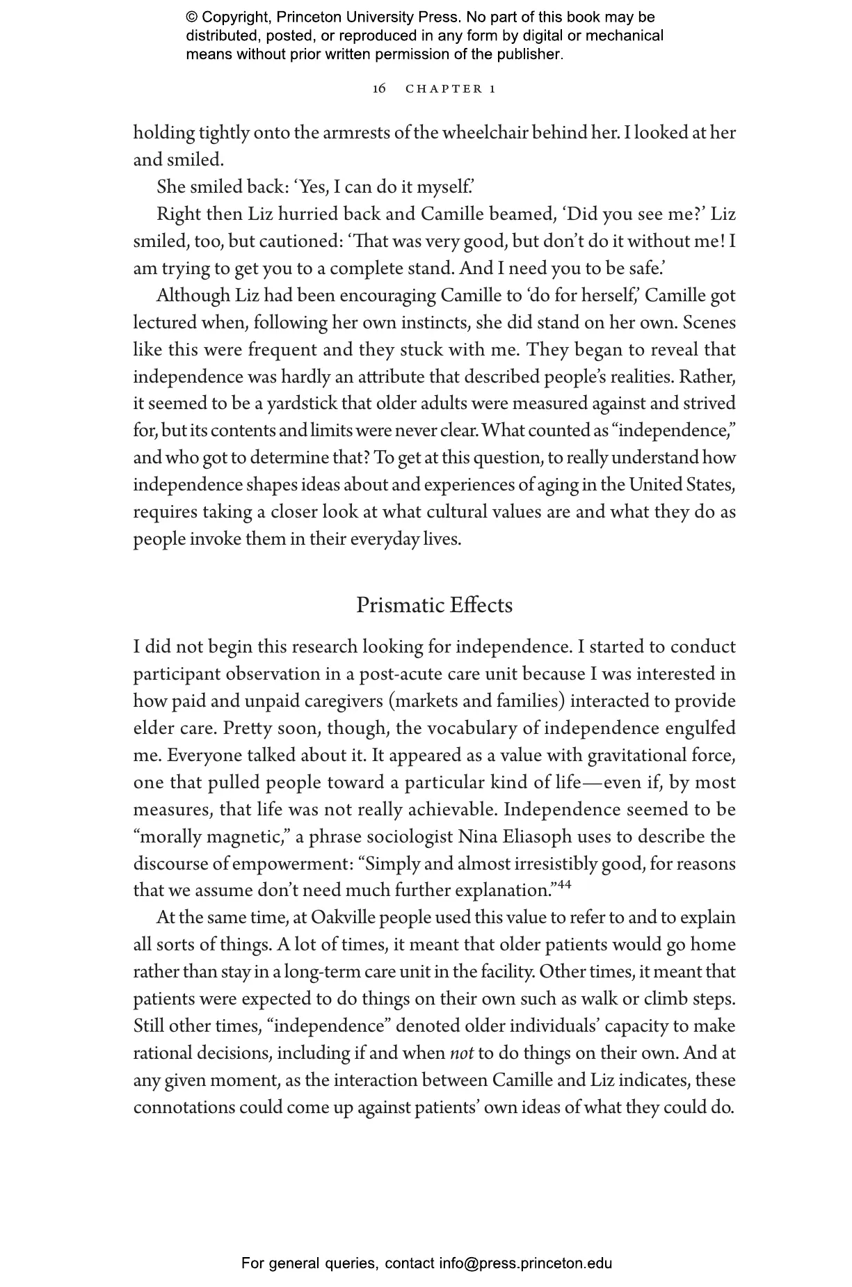 In twenty-first-century America, as people live longer than ever before, it鈥檚 taken for granted that older adults should be active and self-reliant. News stories describe nonagenarians who run marathons, reality shows feature attractive older women competing for the love of a widowed bachelor, and policymakers encourage aging 鈥渋n place鈥 rather than in a nursing home. In Chasing Independence, Guillermina Altomonte turns a critical eye on these expectations and asks what happens when independence becomes the yardstick by which we measure the quality of old age. Drawing on ethnographic observations in a skilled nursing facility in New York City, interviews with older adults and healthcare workers, and historical materials, she shows how independence operates as an unquestioned standard for medical assessments, allocation of services, and even as a way to determine an older person鈥檚 identity and self-worth.