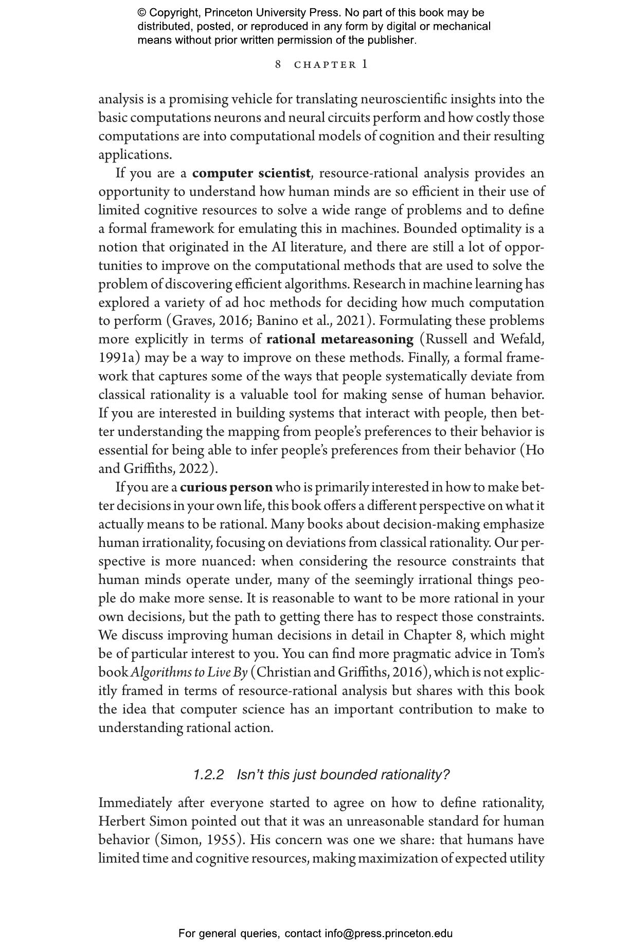 The book presents a formal framework for applying resource-rational analysis to understand and improve human behavior, a set of tools developed by the authors to make this easier, and examples of how they have used this approach to revisit classic questions about human cognition, pose new ones, and enhance human rationality. The book will be a valuable resource for psychologists, economists, and philosophers as well as neuroscientists studying human brains and minds and computer scientists working to reproduce such systems in machines.
