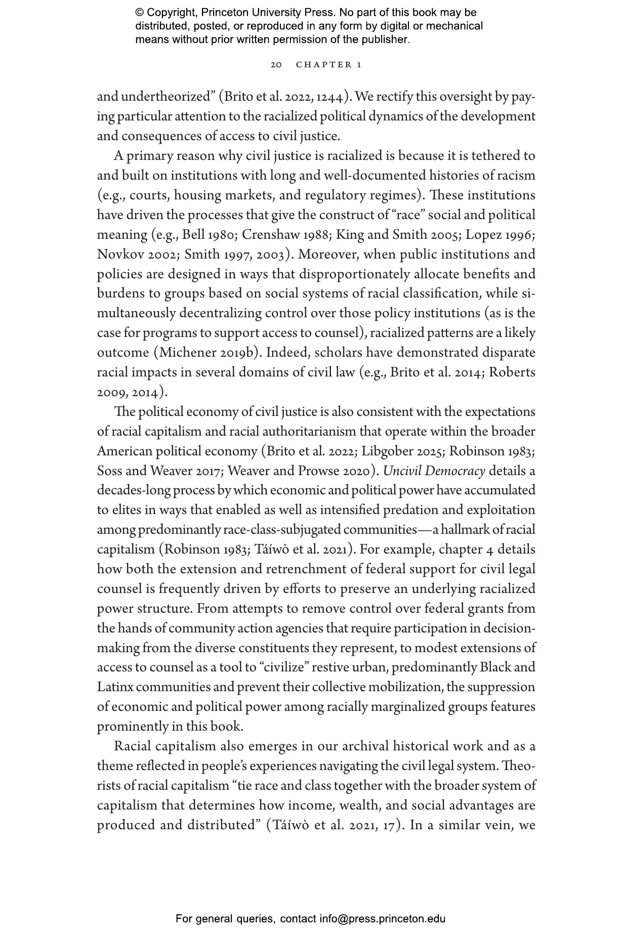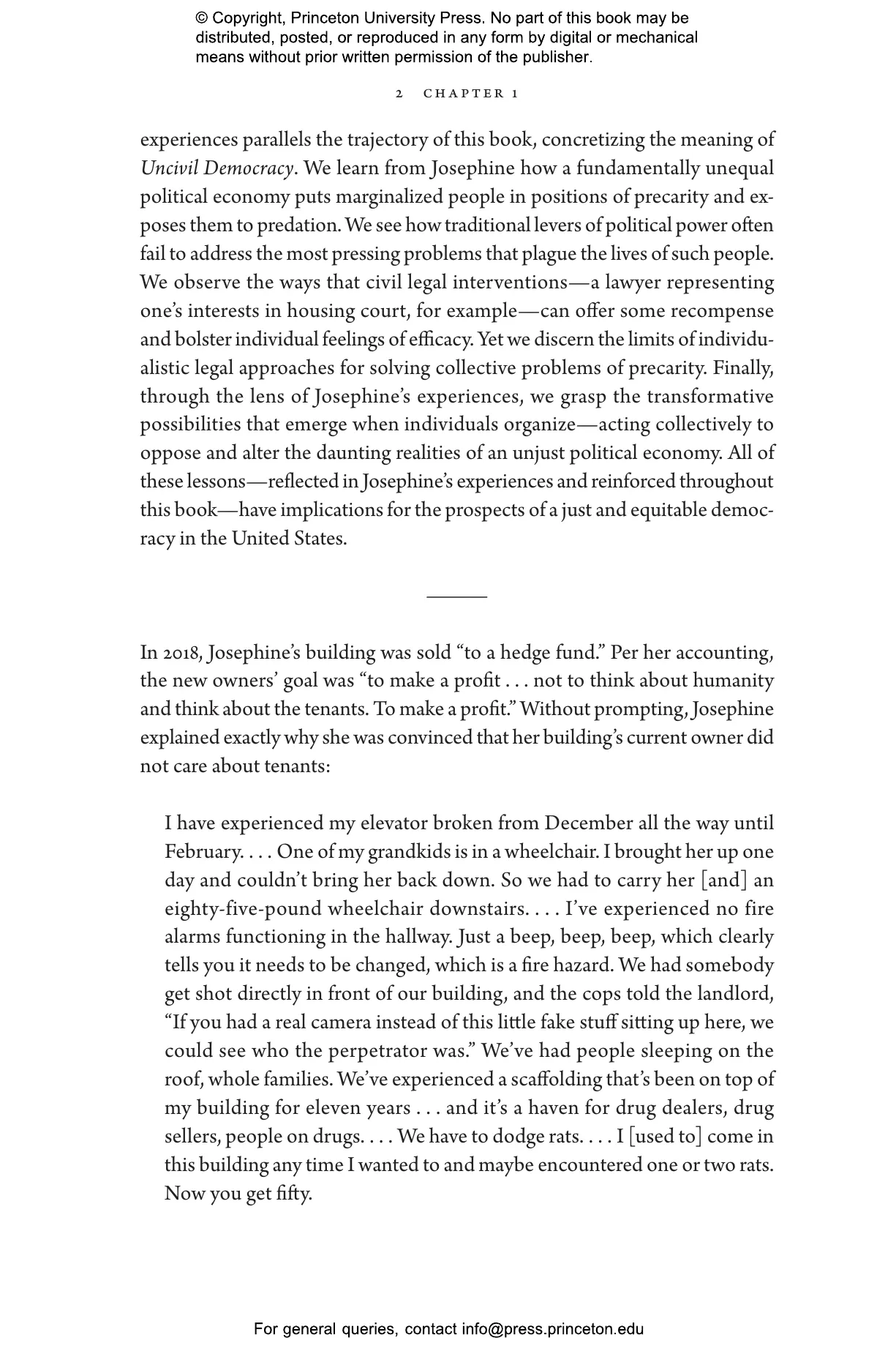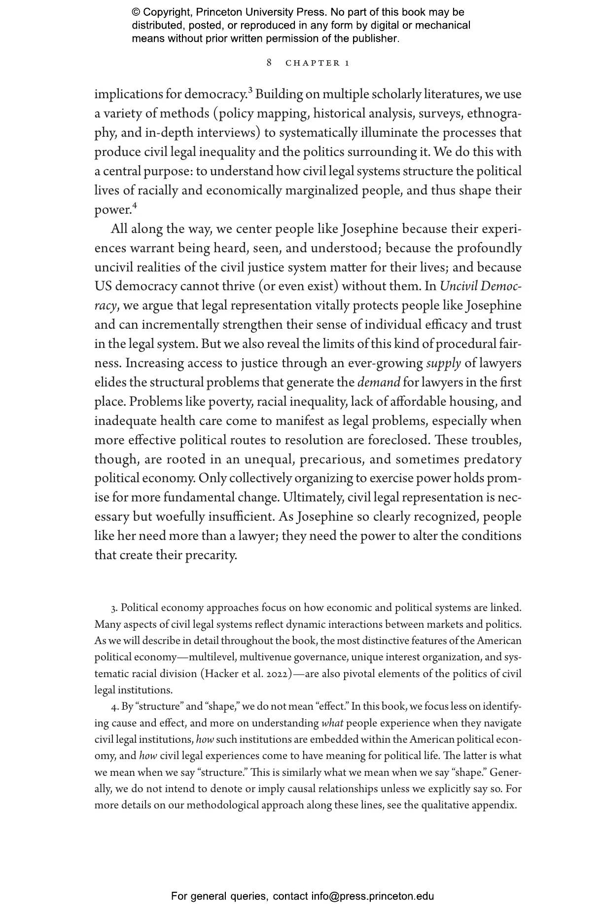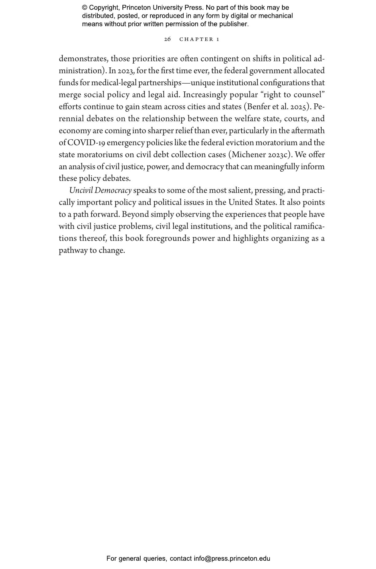Each year, as many as 250 million Americans face civil legal problems like eviction, debt collection, and substandard housing. These problems are disproportionately shouldered by racially and economically marginalized people, particularly women of color. Civil courts and legal aid organizations are supposed to protect their rights, yet more than 90 percent of low-income people receive inadequate or no legal assistance. Instead, access to justice is reserved for those who can afford its high price. For those who can’t, the repercussions can be devastating, from homelessness and loss of public benefits to broken families and diminished health. Uncivil Democracy looks at the US civil justice system through the eyes of the people whose very citizenship is indelibly shaped by it.