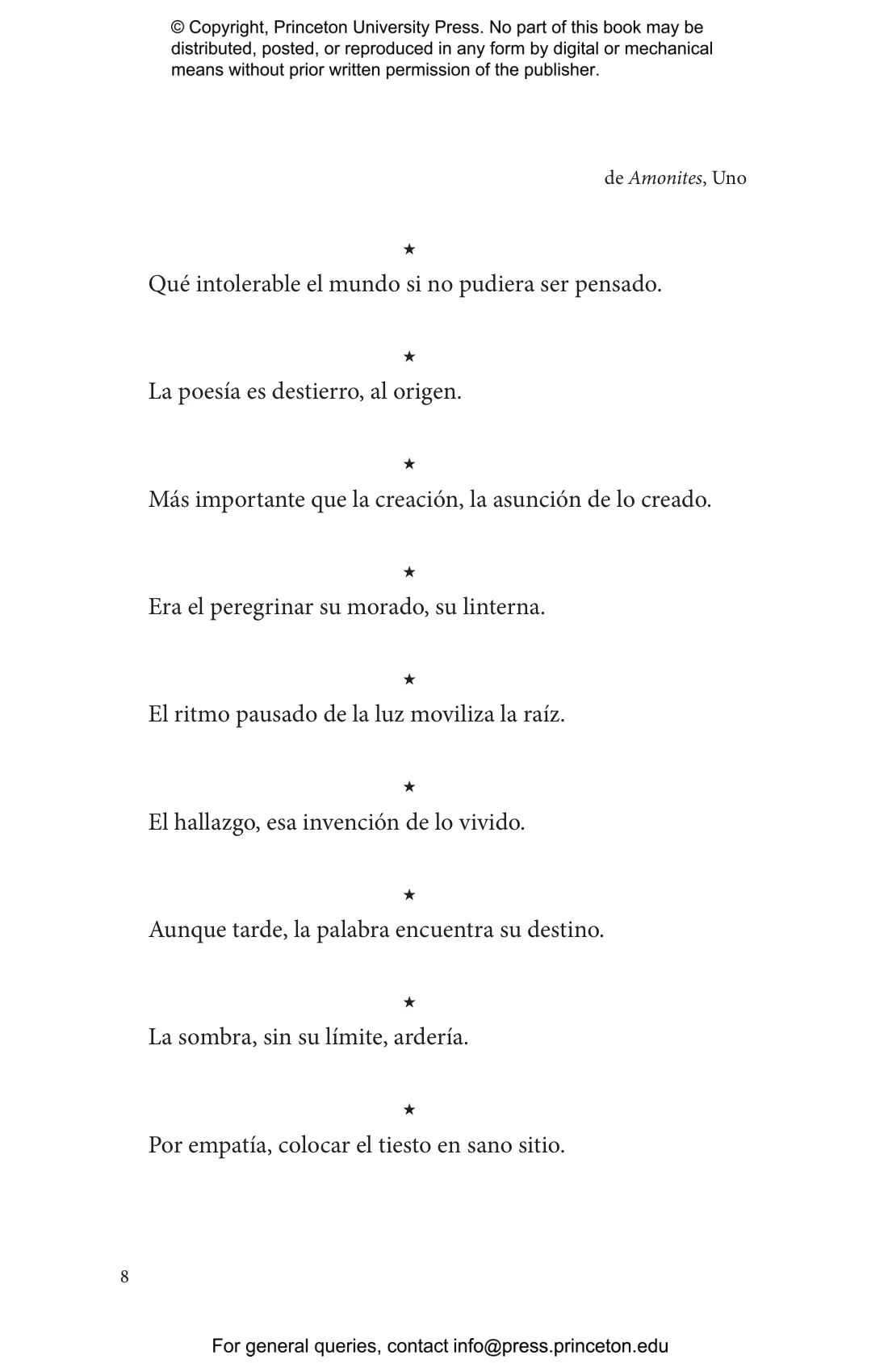 “I would give it all up just to write, for example, these two lines that comprise the extraordinary conclusion to one of her poems: ‘Sangra en el vidrio, / astillada, la claridad’ (Bleeding on the glass, / splintered, the clarity).”—Gonzalo Rojas, winner of the Cervantes Prize and the Reina Sof铆a Prize
