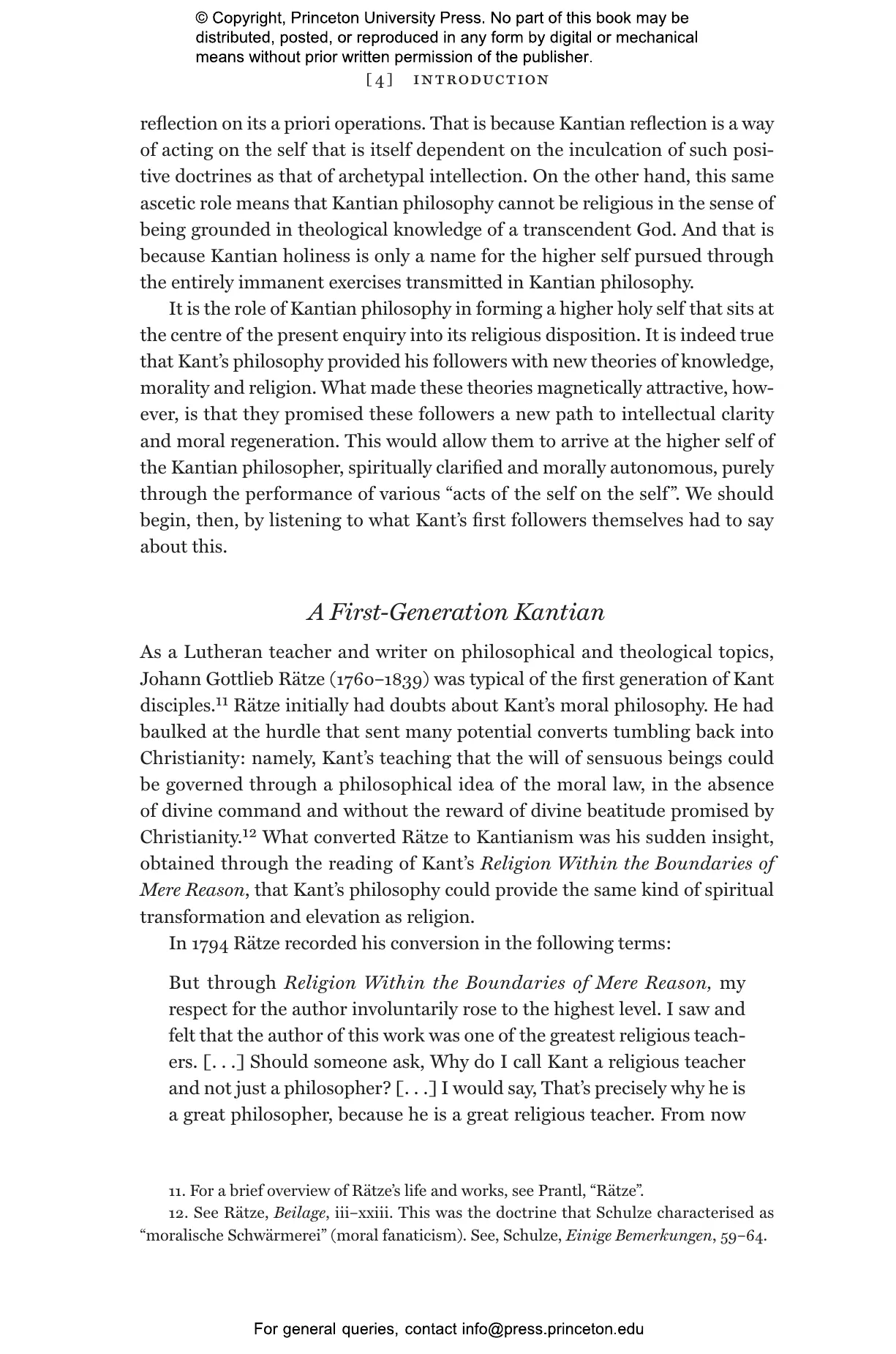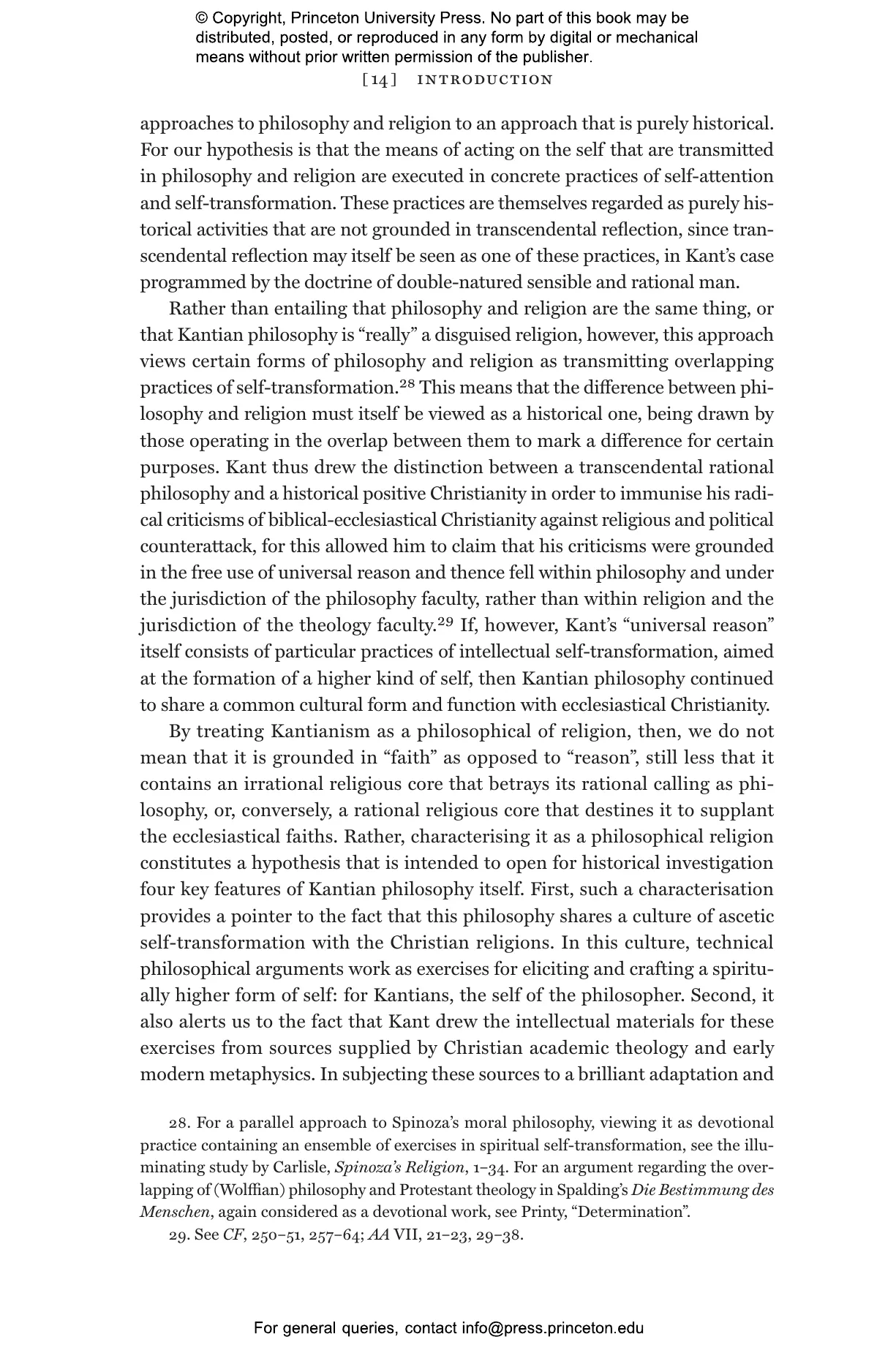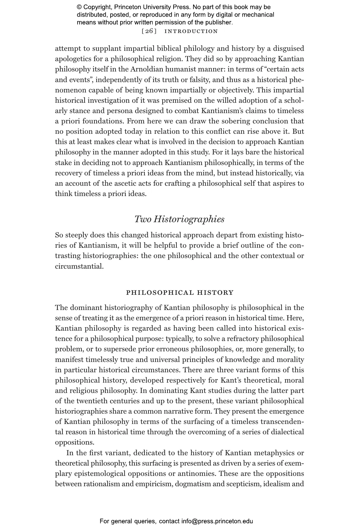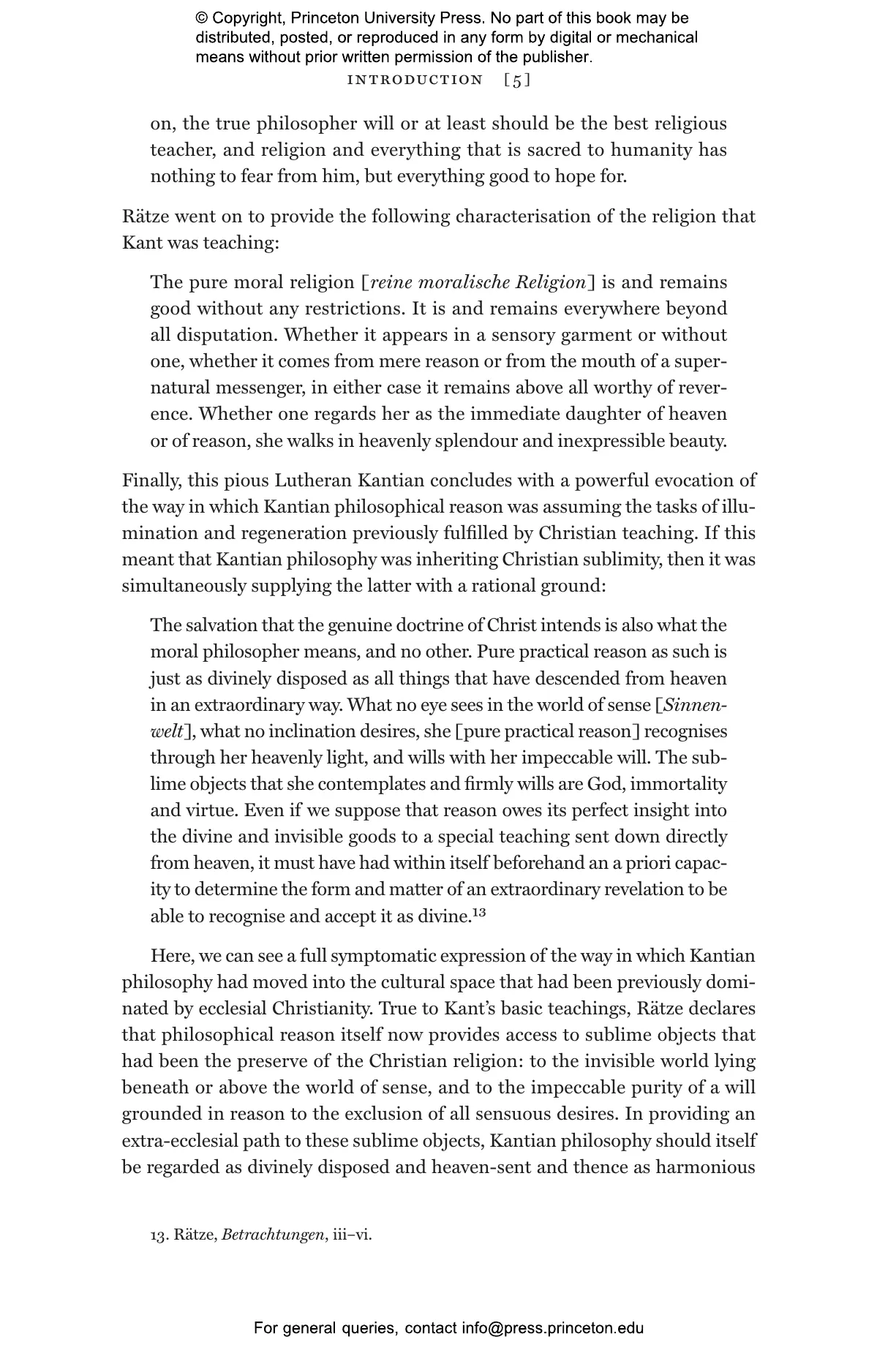 Kantian philosophy is typically viewed as providing a universal theory of knowledge and morality based on timeless principles retrieved from the human mind. In The Kantian Religion, Ian Hunter offers a starkly different account. Hunter contends that Kant鈥檚 arguments were assembled from purely historical sources and served as ascetic devices for crafting the towering self of the Kantian philosopher; they were exercises in intellectual self-clarification and moral transformation undertaken by a cohort of the philosophically educated in search of spiritual clarity and moral purity. These 鈥渟olemn rites of the mind鈥 were seen as heir and rival to the regenerative resources and cultural importance of the Christian religion, and Kantianism was characterized as a philosophical religion.