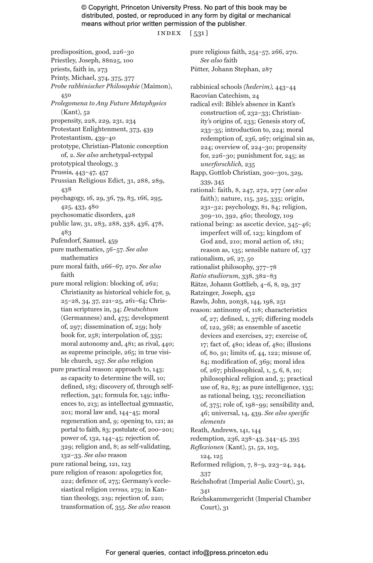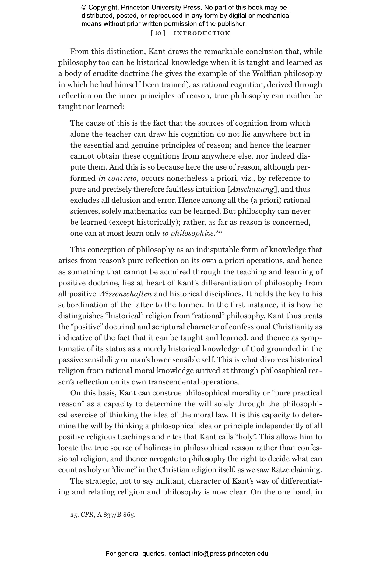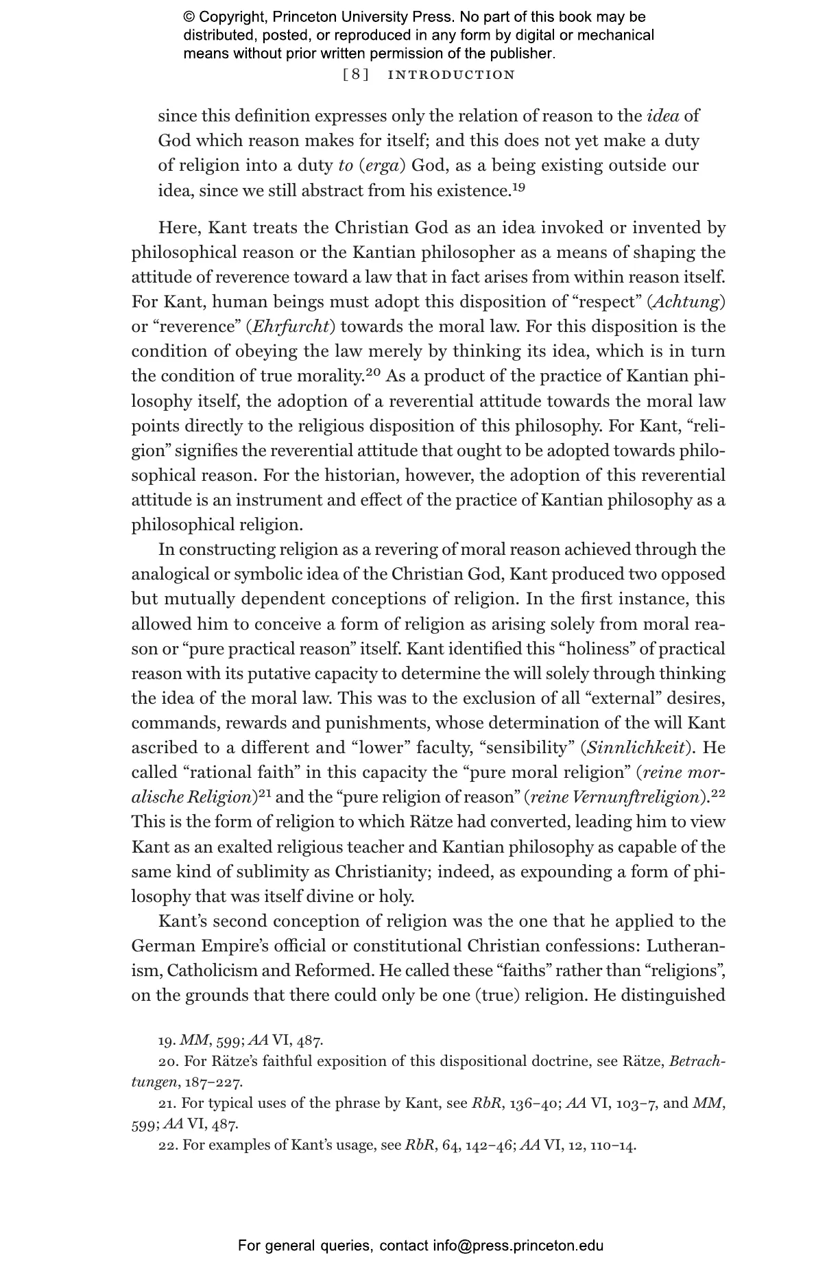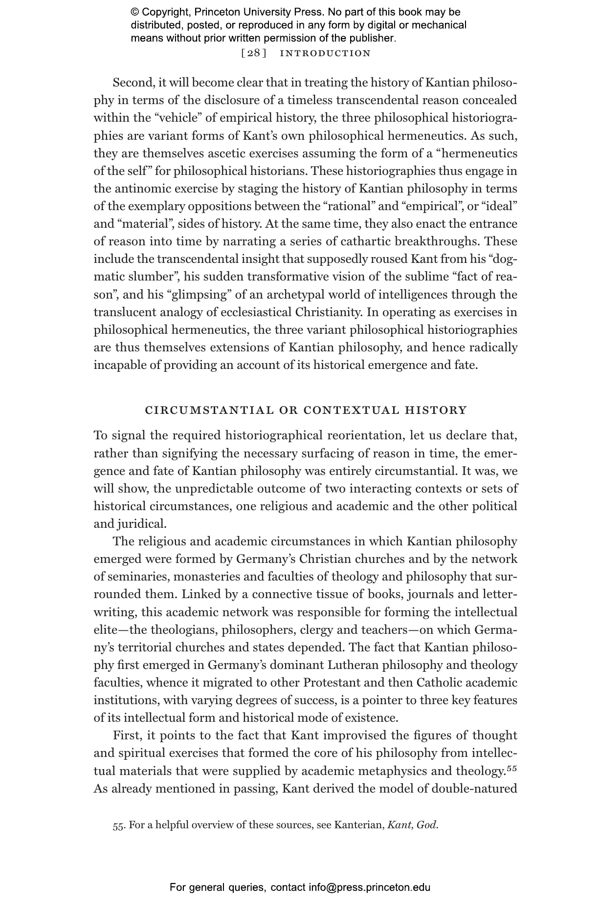Kantian philosophy is typically viewed as providing a universal theory of knowledge and morality based on timeless principles retrieved from the human mind. In The Kantian Religion, Ian Hunter offers a starkly different account. Hunter contends that Kant鈥檚 arguments were assembled from purely historical sources and served as ascetic devices for crafting the towering self of the Kantian philosopher; they were exercises in intellectual self-clarification and moral transformation undertaken by a cohort of the philosophically educated in search of spiritual clarity and moral purity. These 鈥渟olemn rites of the mind鈥 were seen as heir and rival to the regenerative resources and cultural importance of the Christian religion, and Kantianism was characterized as a philosophical religion.