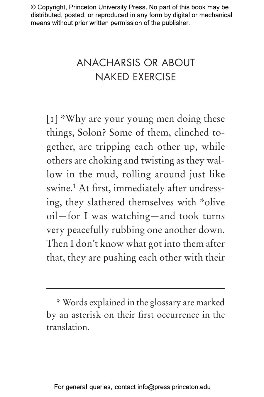 Pitting a sports skeptic, Anacharsis, against a superfan, Solon, this delightful and thought-provoking work tries to make sense of sports. Why do so many of us care so much about them? Are sports like boxing too violent? Should we take fitness so seriously? Do athletics have educational value? And, most important of all, why did the ancient Greeks exercise naked? While Anacharsis, observing a Greek sport that sounds something like mixed martial arts, asks what kind of citizens set aside serious affairs to watch young men beat each other to a pulp, Solon counters that sports have great civic benefits and that athletes are ultimately competing for the highest prize鈥攈uman excellence.