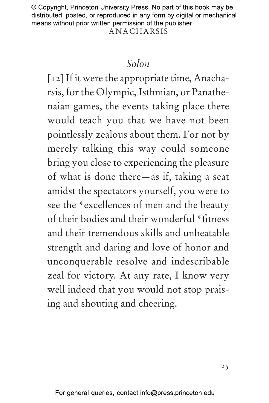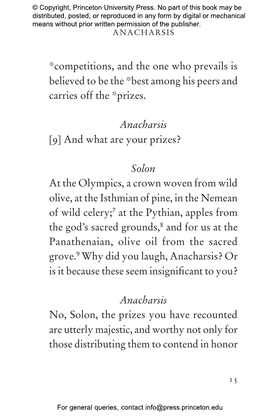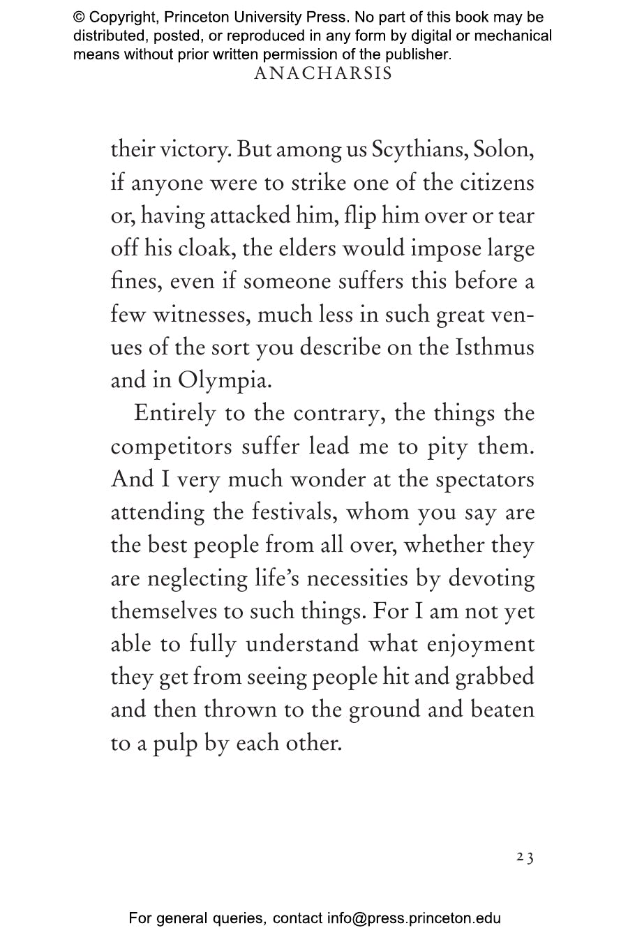 "[Reid and Mitsis's] translation is so immediate you can feel the athletes flinging sweat into your eyes. . . . Like boxers in the ring, Anacharsis and Solon take their best shots for and against the value of athletic competition. It’s a rousing, rhetorical battle that’s still playing out in college boardrooms, newspaper columns, and state legislatures — but never this wittily."鈥擱on Charles