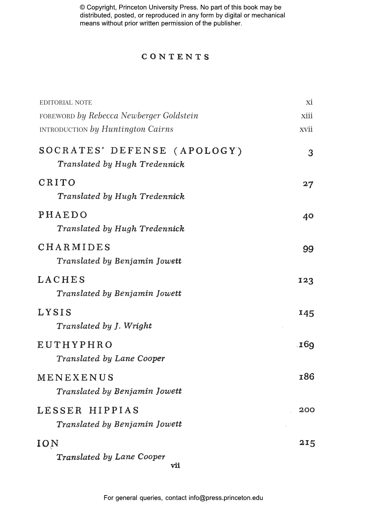 Edith Hamilton (1867–1963) was perhaps the most famous and influential classicist of the twentieth century. Her bestselling Mythology remains a standard version of the stories of the ancient world. Huntington Cairns (1904–1985) was a writer and lawyer who worked at different times for the U.S. Treasury, the National Gallery of Art in Washington, DC, and Johns Hopkins University. Rebecca Newberger Goldstein is a philosopher and novelist whose books include Plato at the Googleplex and Thirty-Six Arguments for the Existence of God.